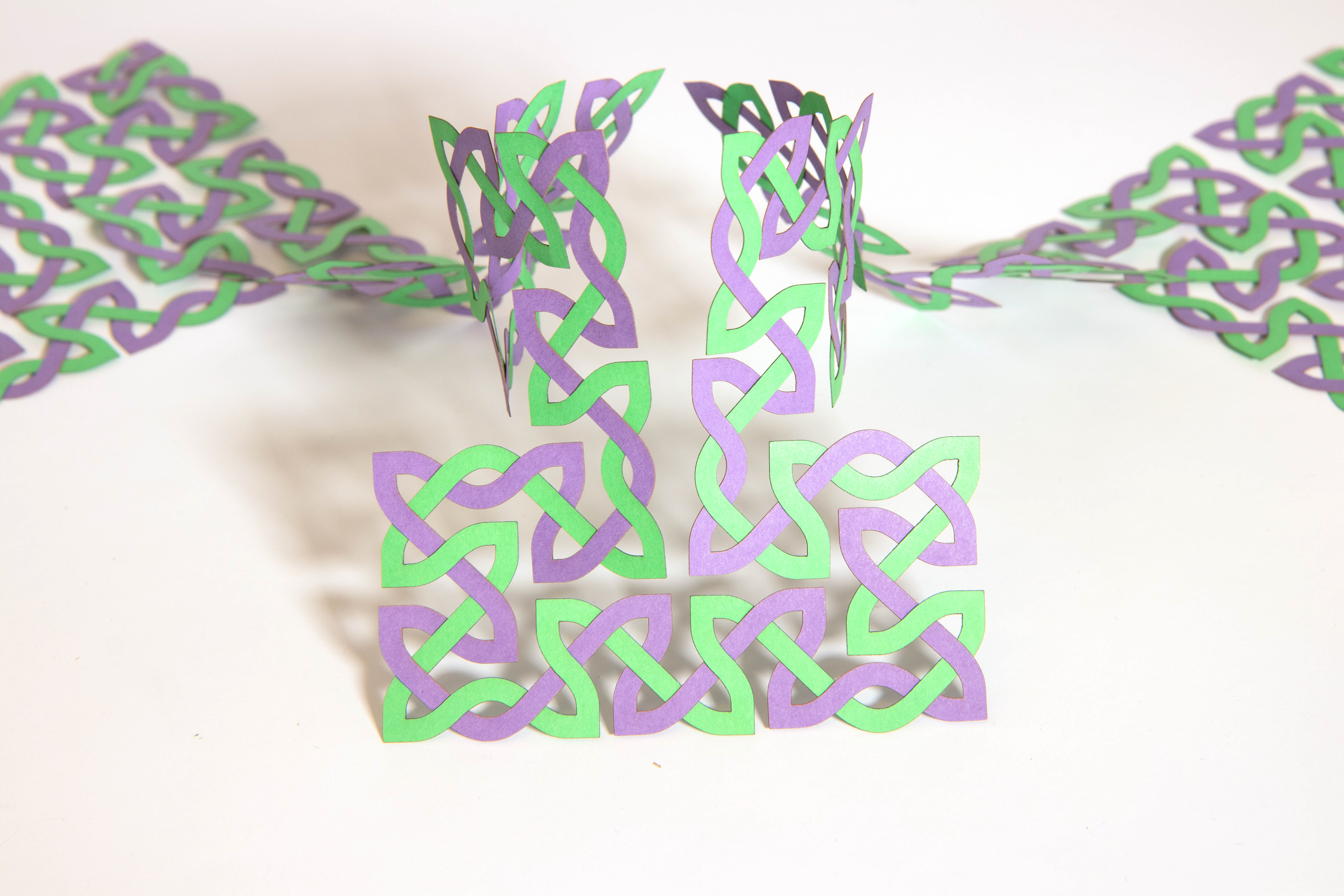 These are Celtic knotwork patterns realized in paper. Paper is perfect for work that lies between 2D and 3D, and Celtic knots fits perfectly in this category: they are usually presented in a flat medium, but they also have depth, being alternating knots, in which the crossings alternate between being underpasses and overpasses.