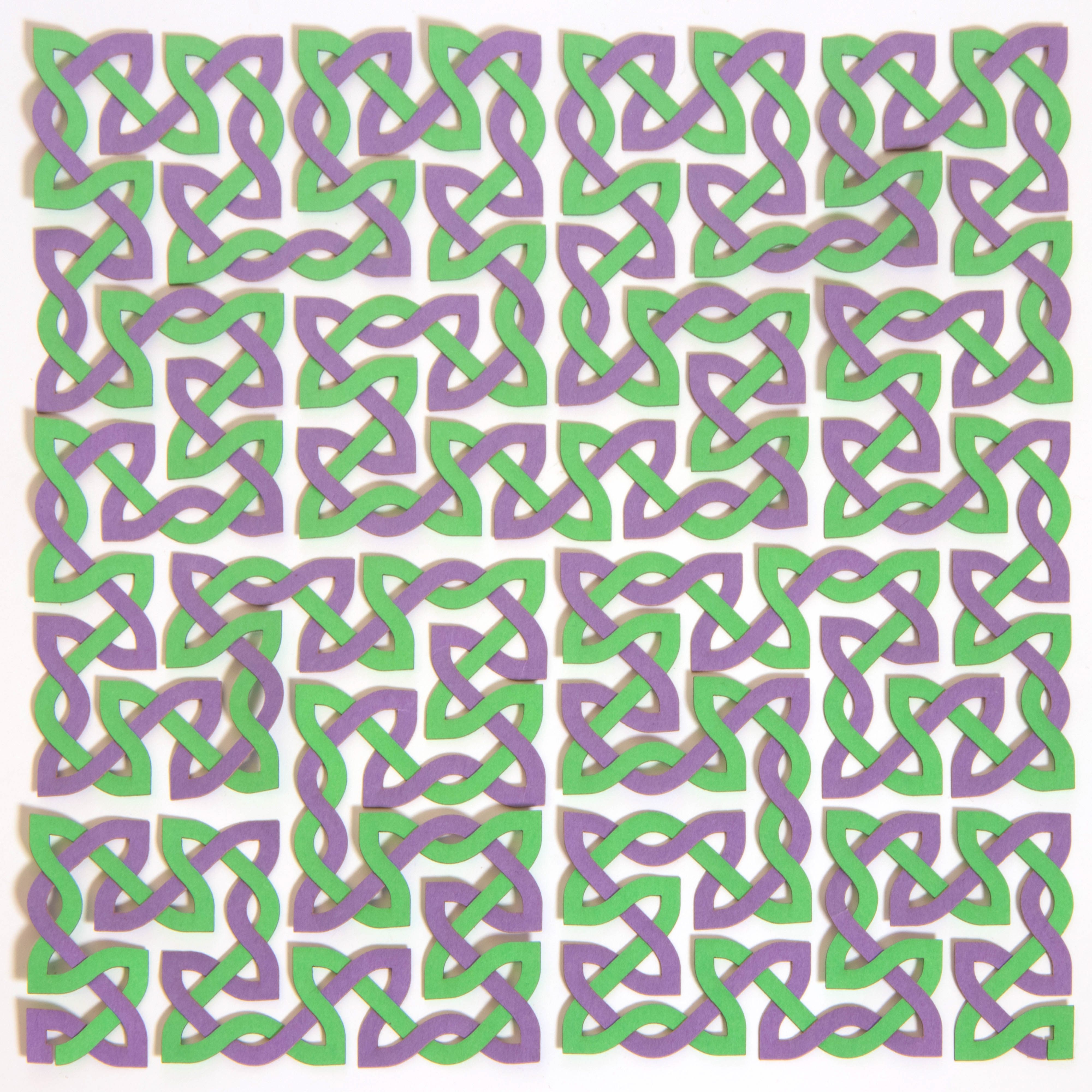 The purple and green design is an “unknot” where one half is made from green paper and the other is made from purple paper. Since the strands are overlapping in the design, it is impossible to cut this design out from a single piece of paper. I therefore cut out the two parts separately, wrapped them around each other, and connected the ends. If you look closely at the bottom left and bottom right, you can see that this is exactly where the strands change color.
