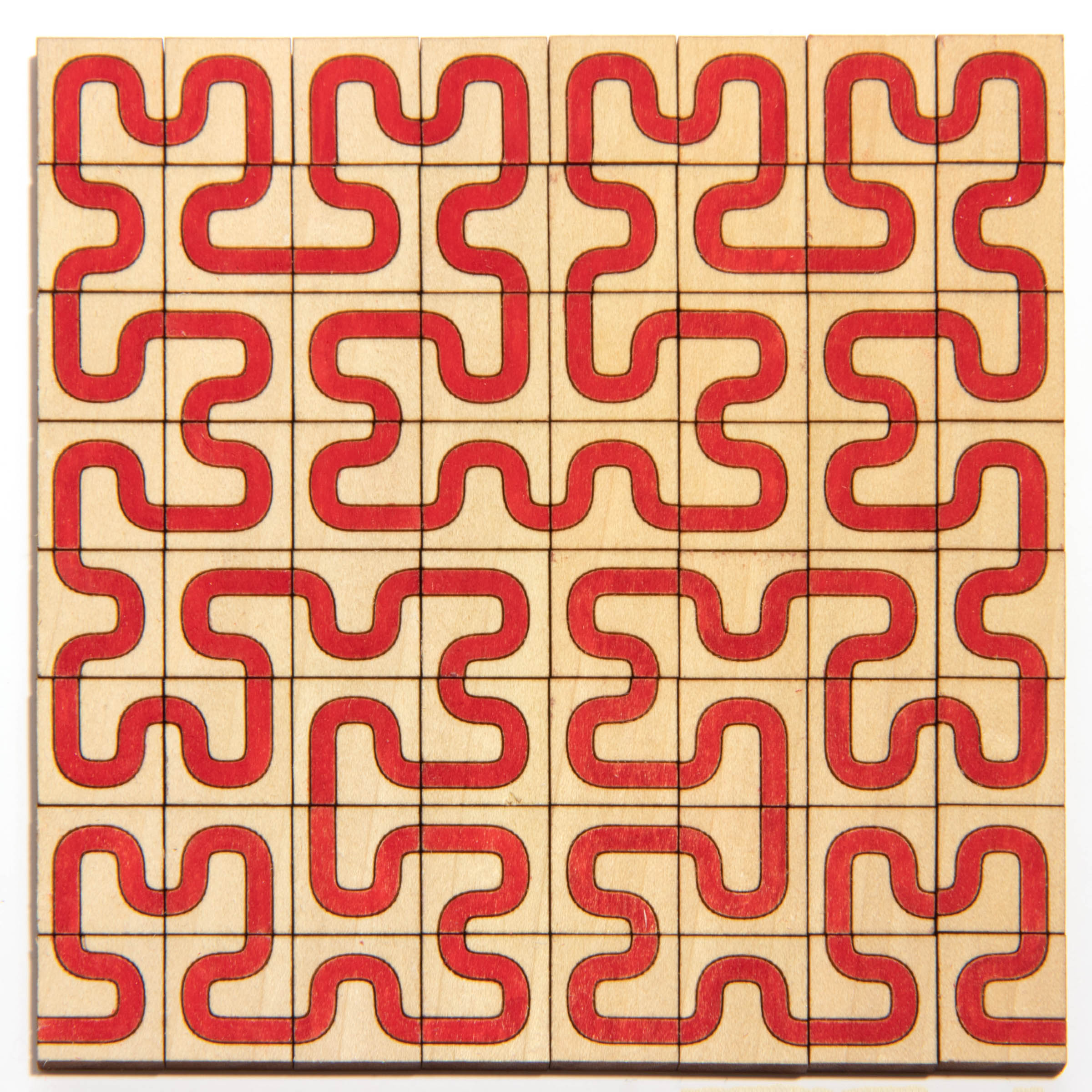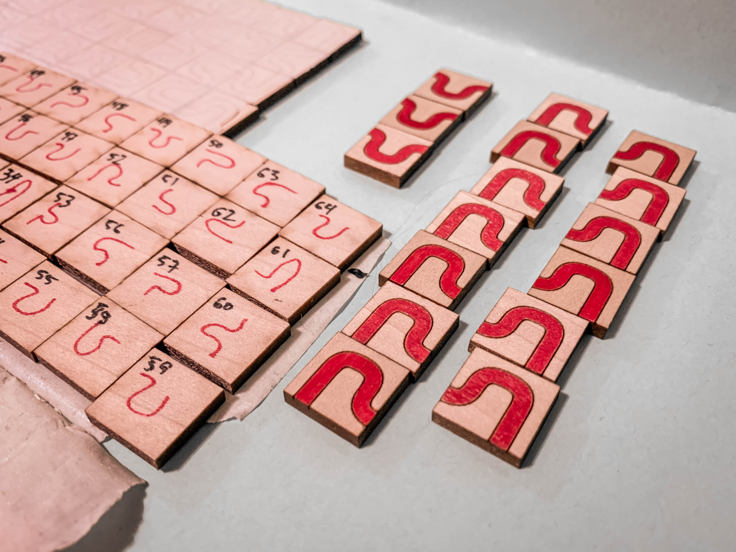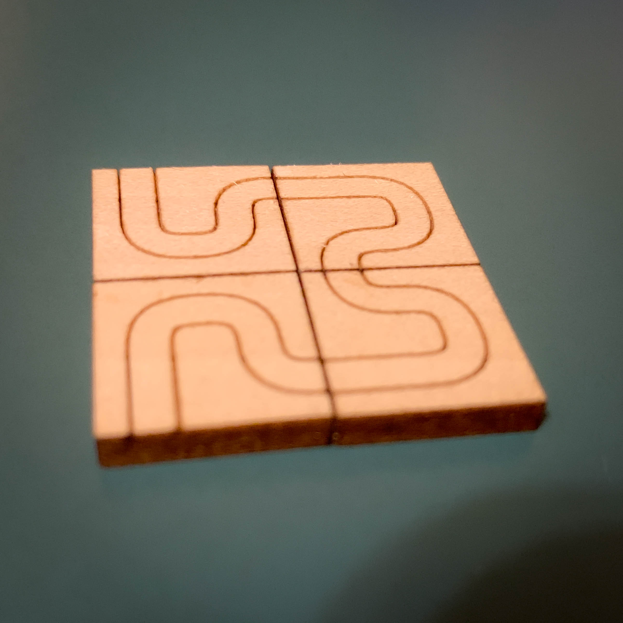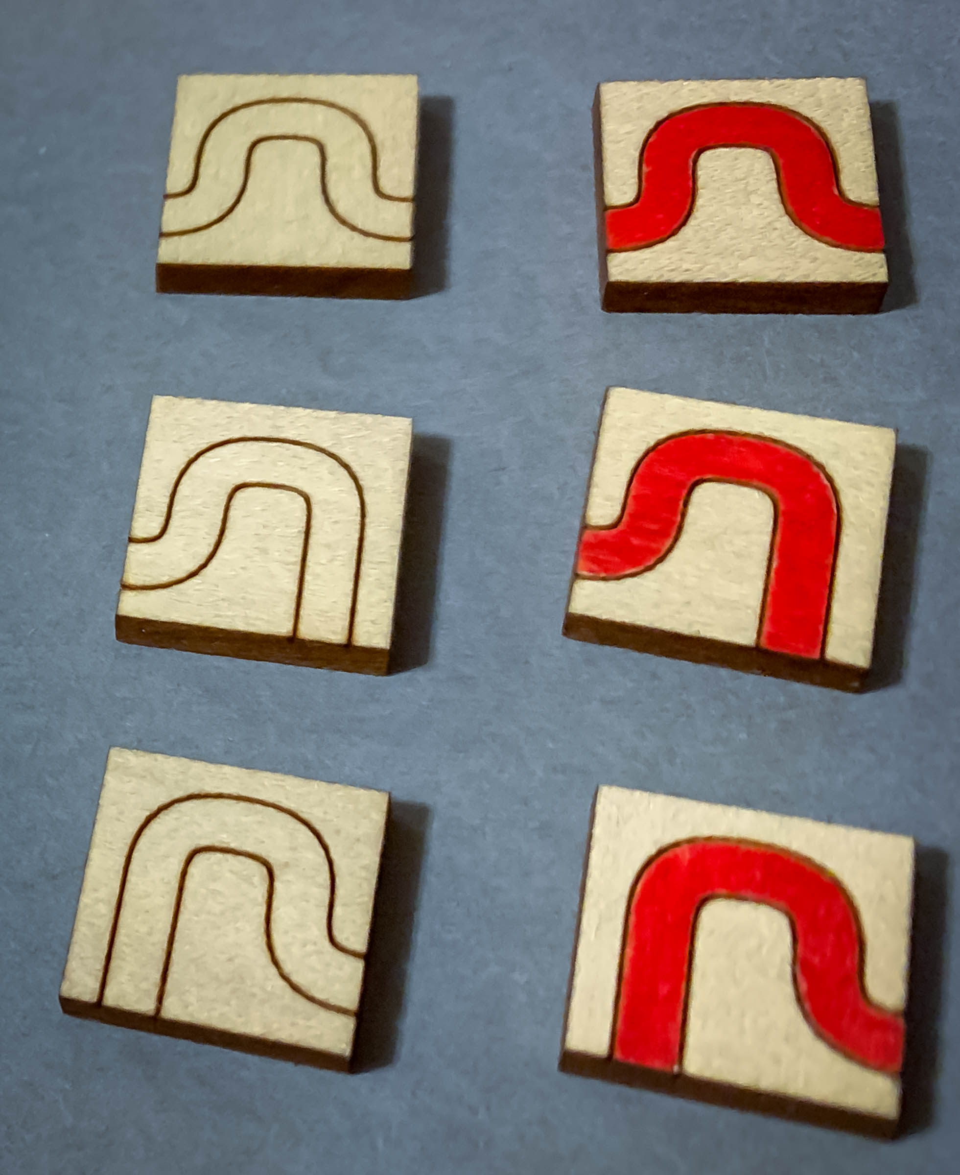 This is a tiling system, with only three types of tiles, that trace out the curve. The tiles correspond precisely to the instructions “turn left”, “turn right”, and “move forward”. These wooden tiles were created with a laser cutter and colored by hand. Below are some pictures of this process.