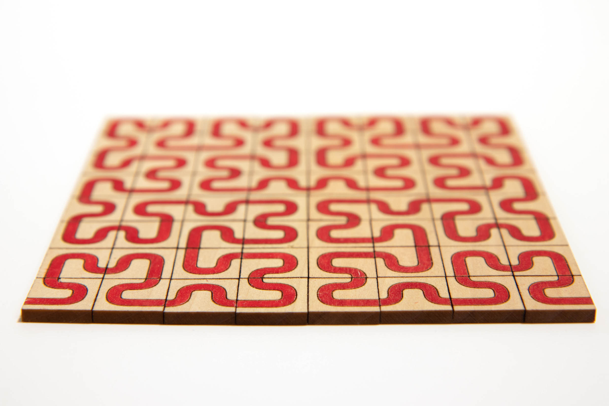 The Hilbert curve can also be defined by a set of tiles. The tiles were cut out and colored by hand afterwards. (Photo: Edmund Harriss)