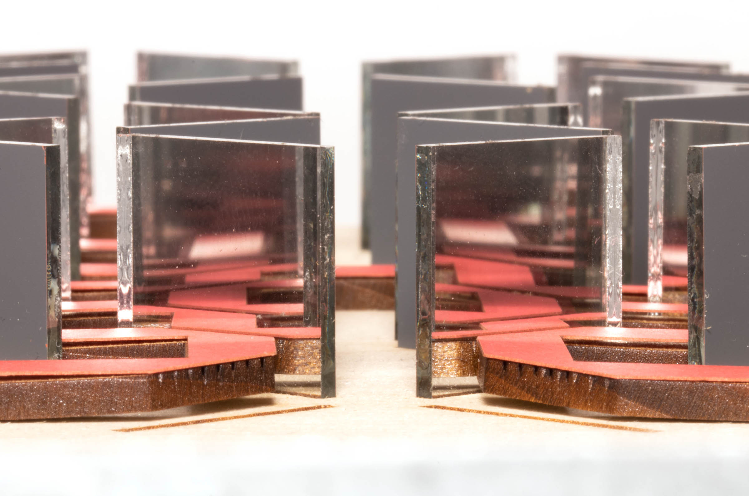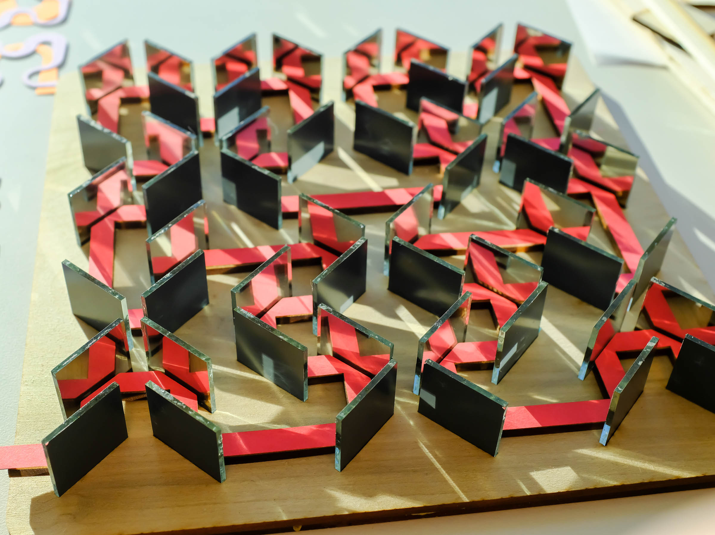 The labyrinth is made of different parts: The base is made of two pieces of wood glued together, and the top layer has slits precisely cut to hold the 52 mirrors in such a way that the back sides of the mirrors were on the appropriate diagonals.