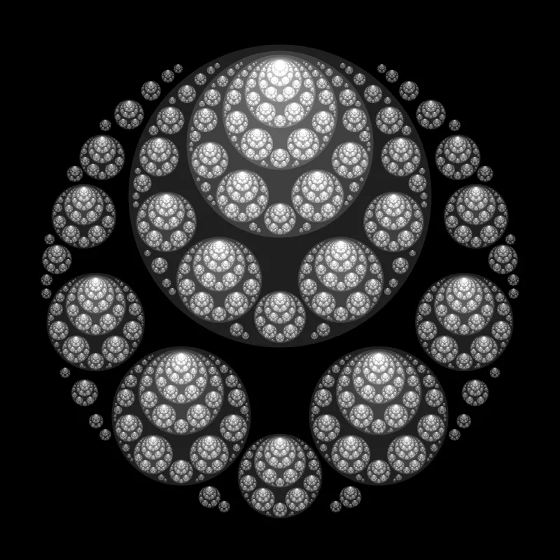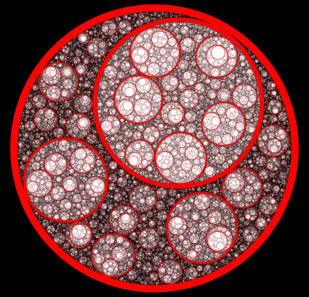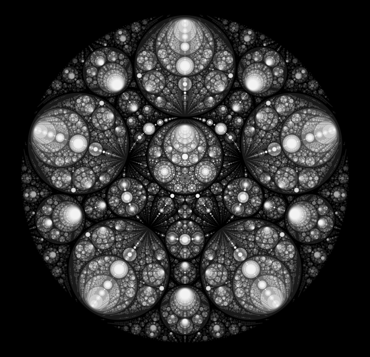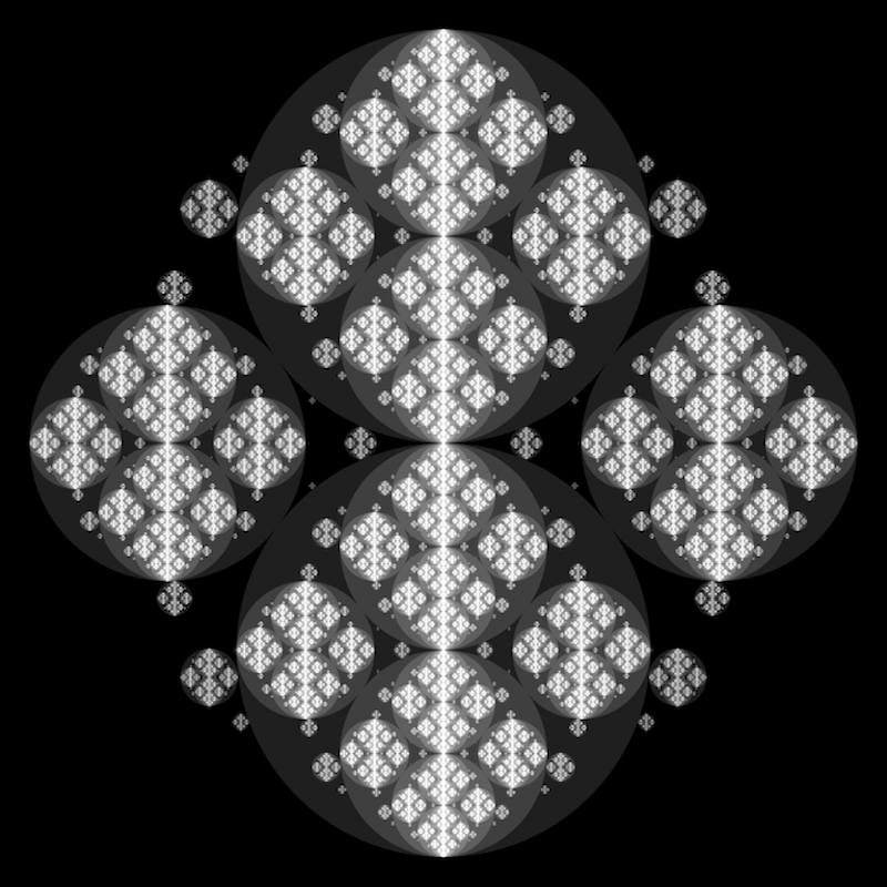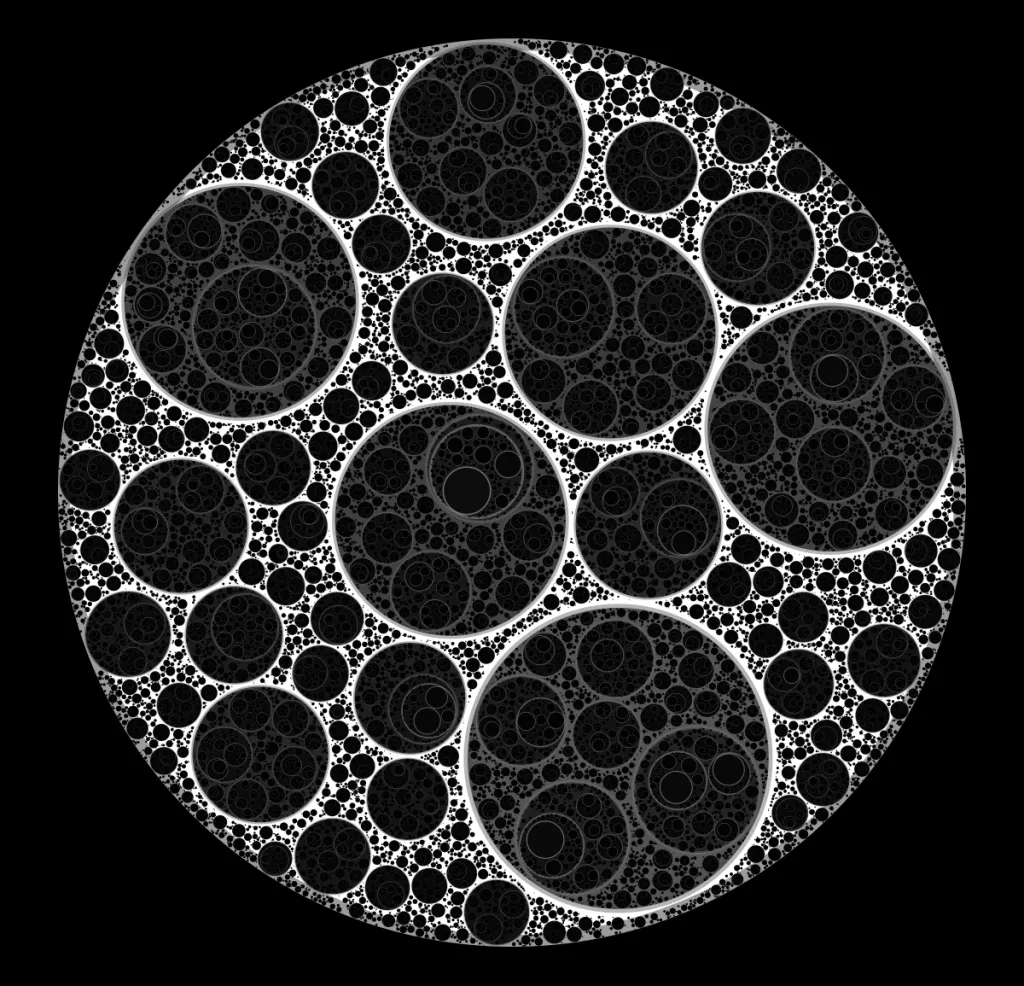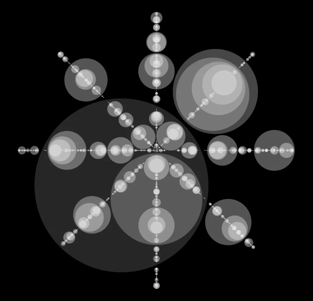 These following four images emerge from picking points at random and constraining the depth – the number of enclosing circles – to certain numbers.