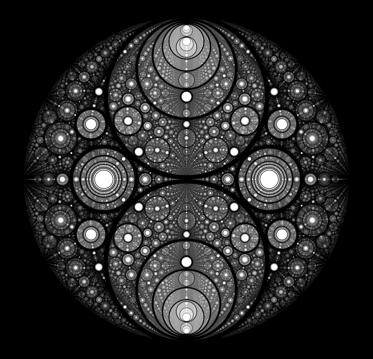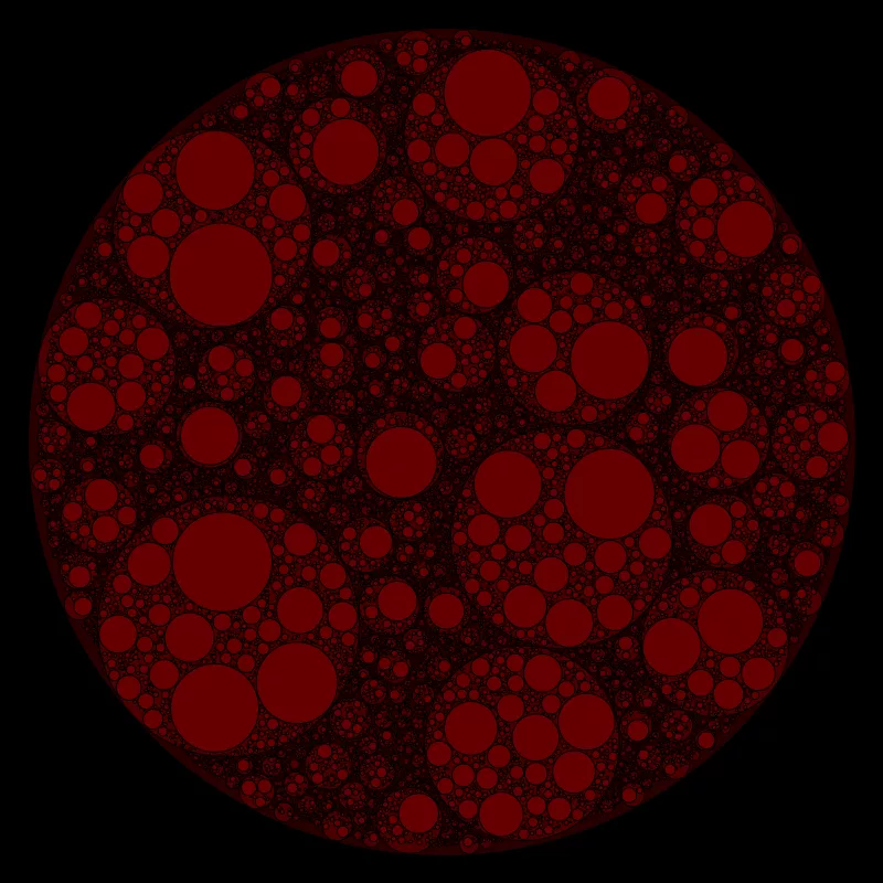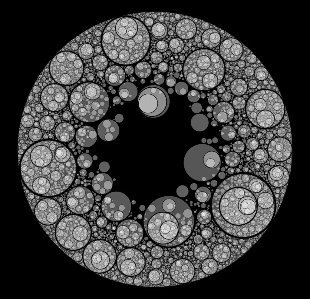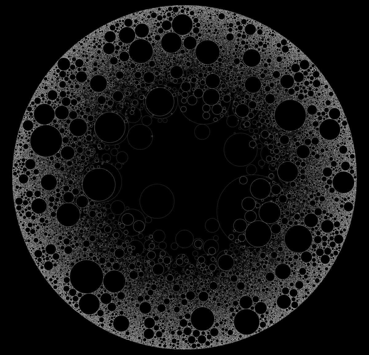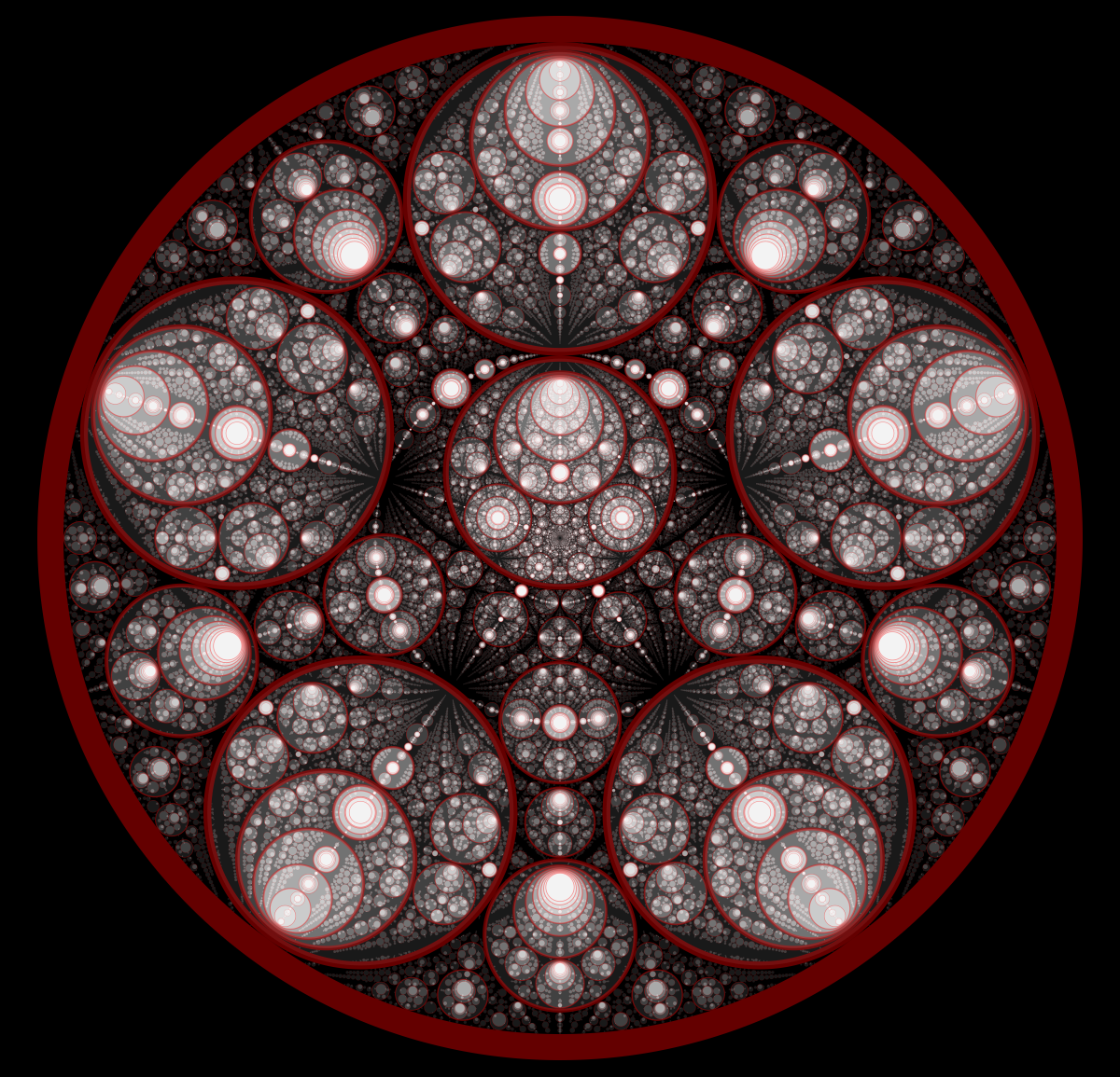 These following four images emerge from picking points at random and constraining the depth – the number of enclosing circles – to certain numbers.