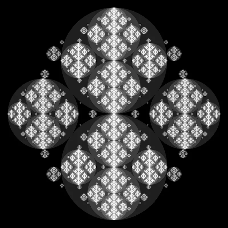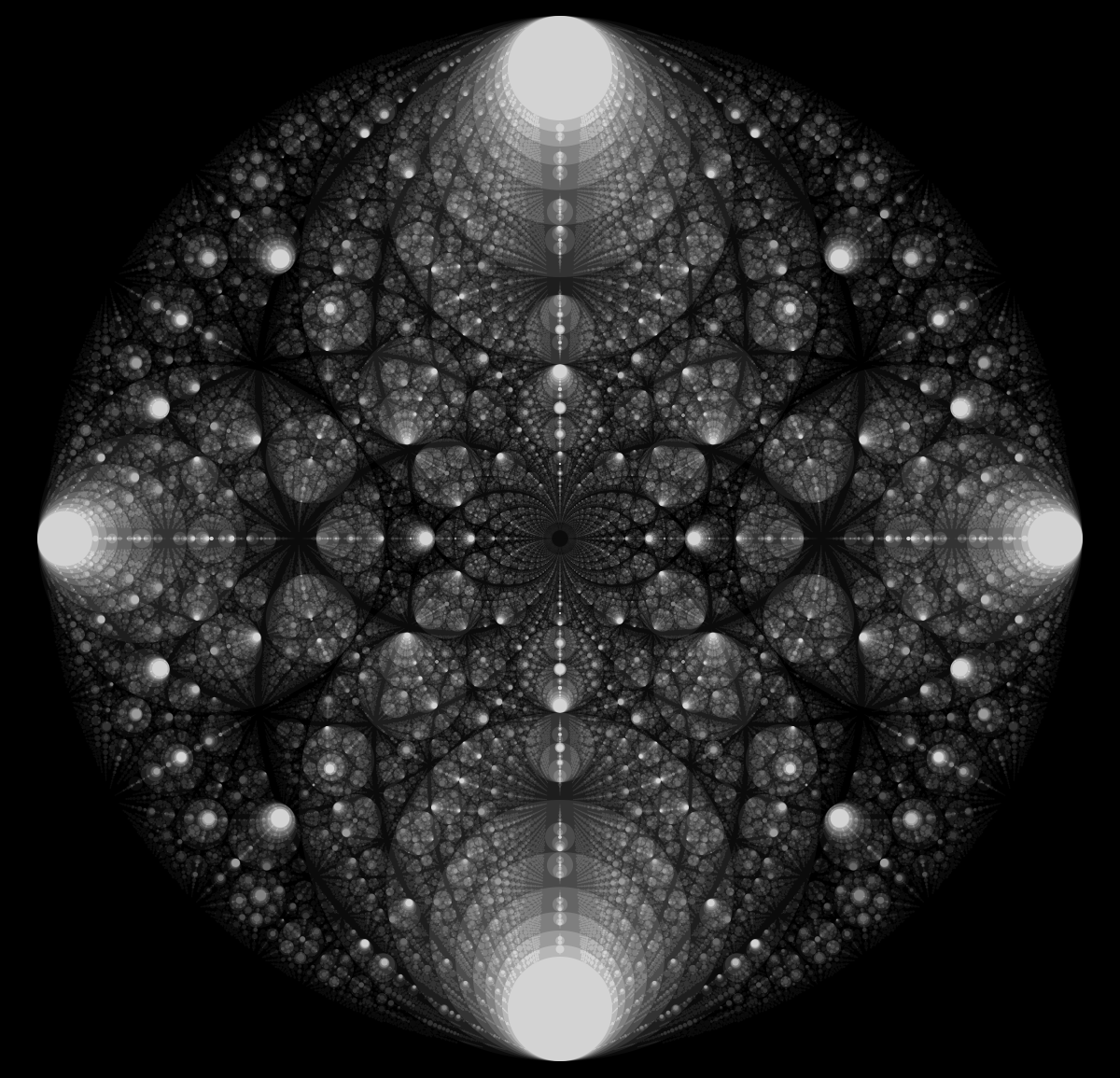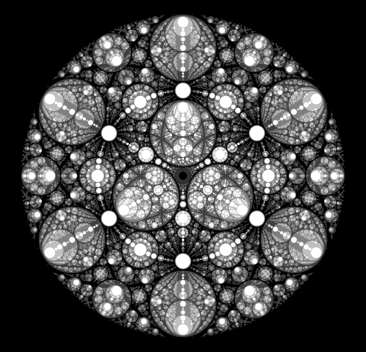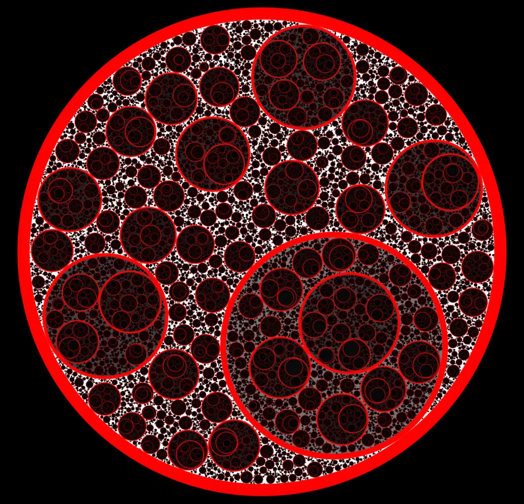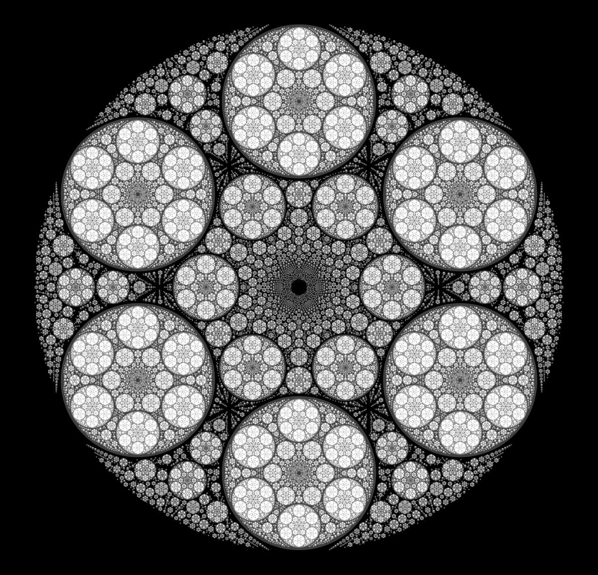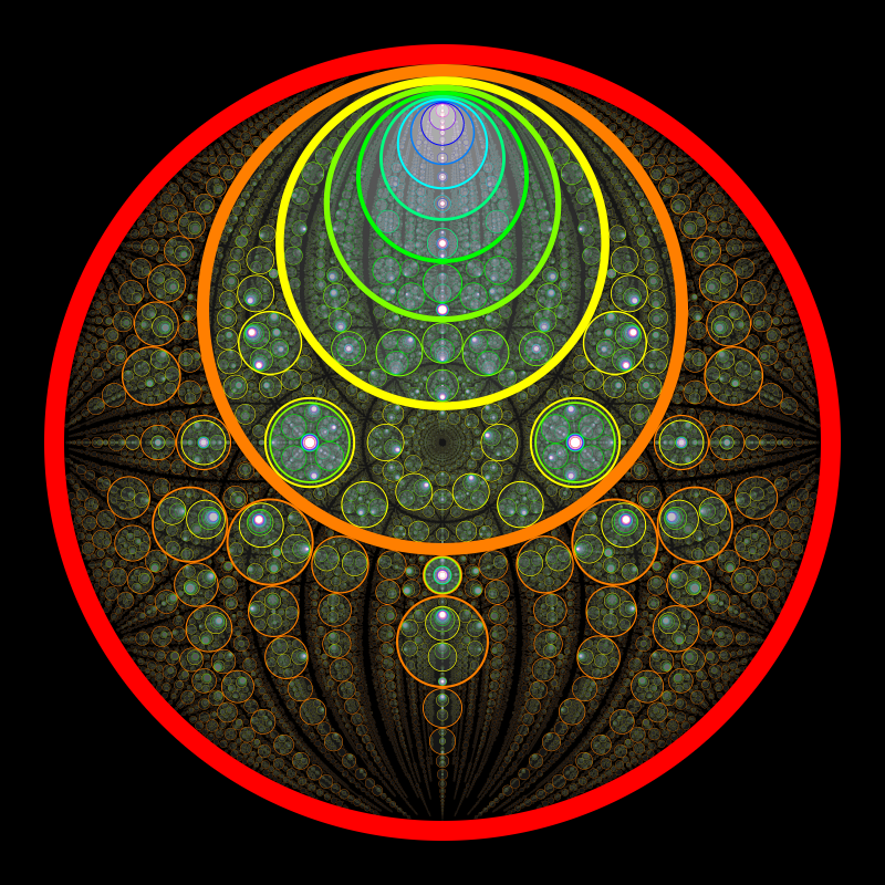 These following four images emerge from picking points at random and constraining the depth – the number of enclosing circles – to certain numbers.