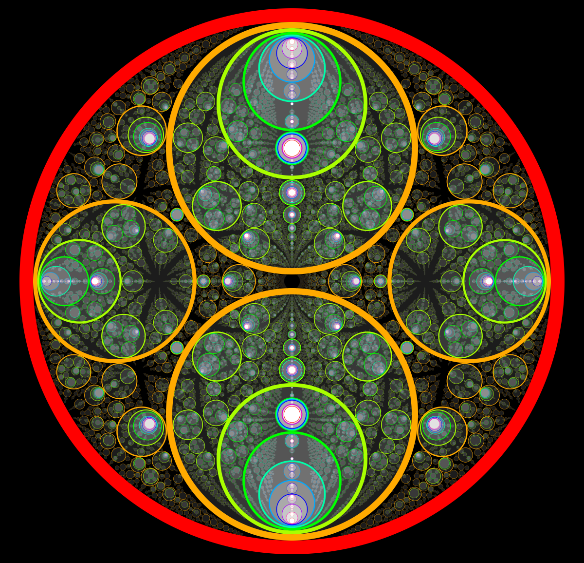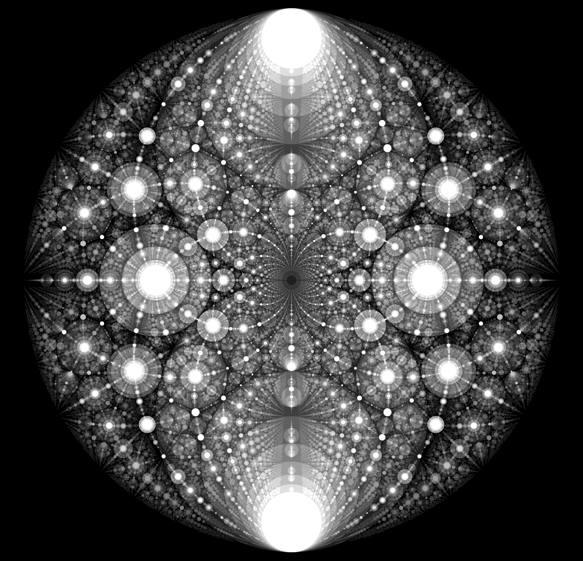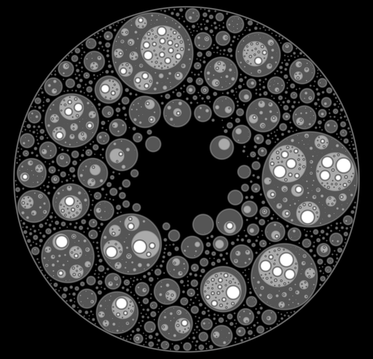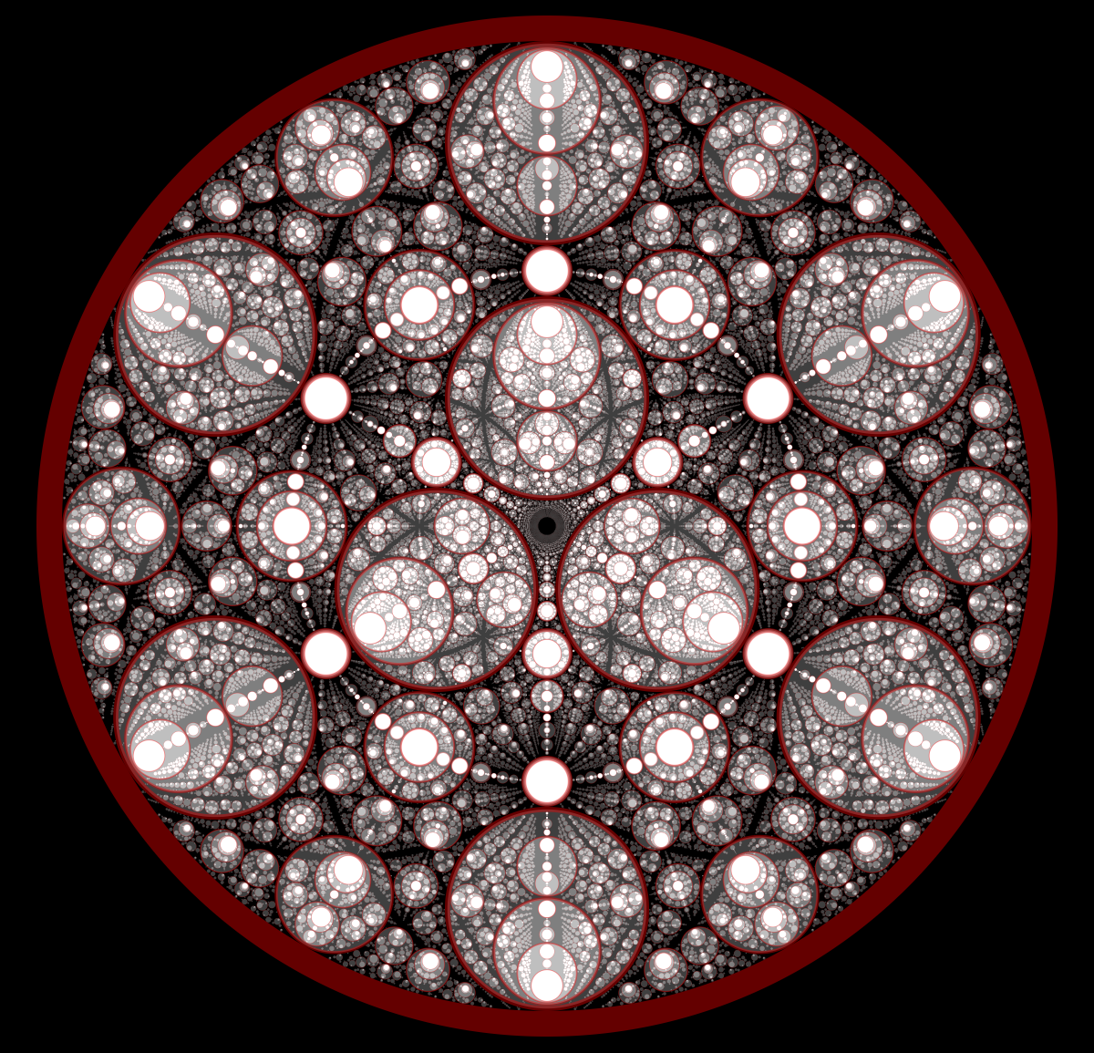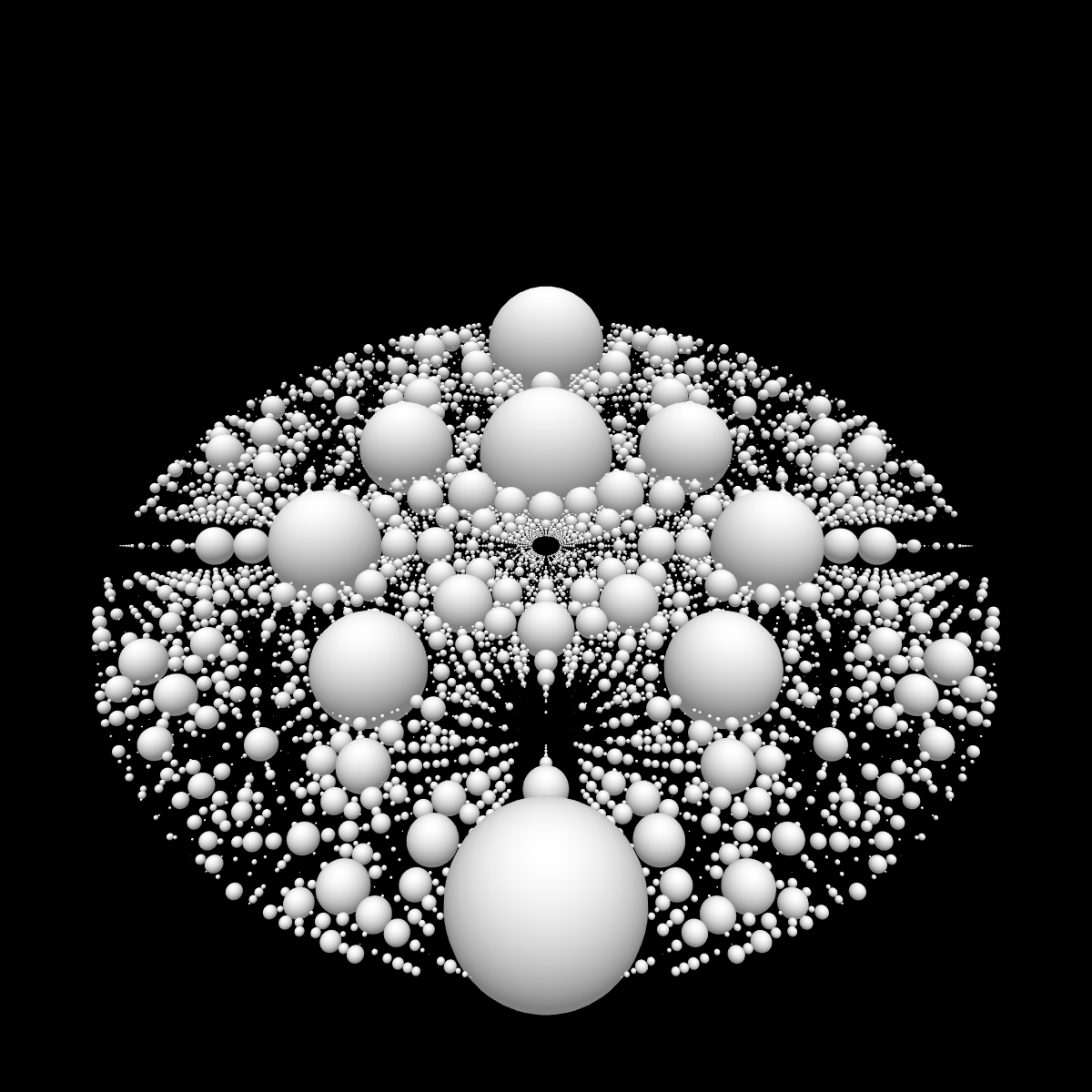 These following four images emerge from picking points at random and constraining the depth – the number of enclosing circles – to certain numbers.
