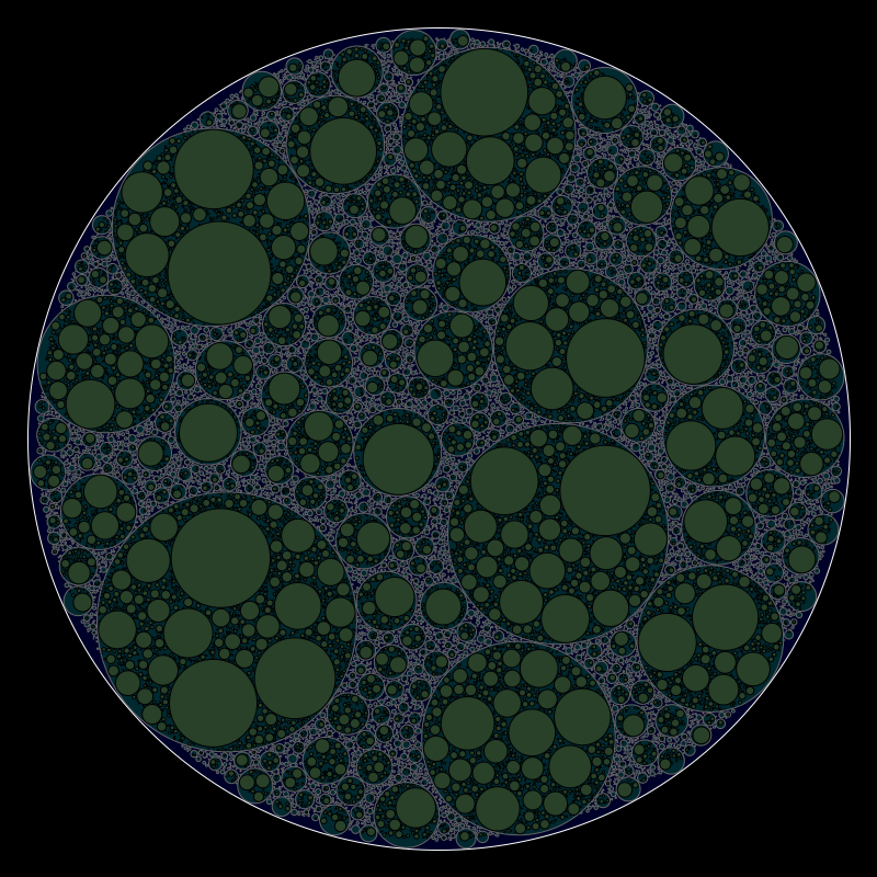 Here are some experiments (work-in-progress) with randomized circle packings. The algorithm is deceptively simple: Start with an initial circle and repeatedly choose a point, according to some algorithm, inside of the initial circle and add the largest circle possible having this point as its center. By constraining the way the points are chosen, a variety of different figures emerges. How many circles are enclosing the point? What is the angle of the point? How far from the center is the point? If points are only allowed to be added given that certain properties are satisfied, we obtain different visual effects.