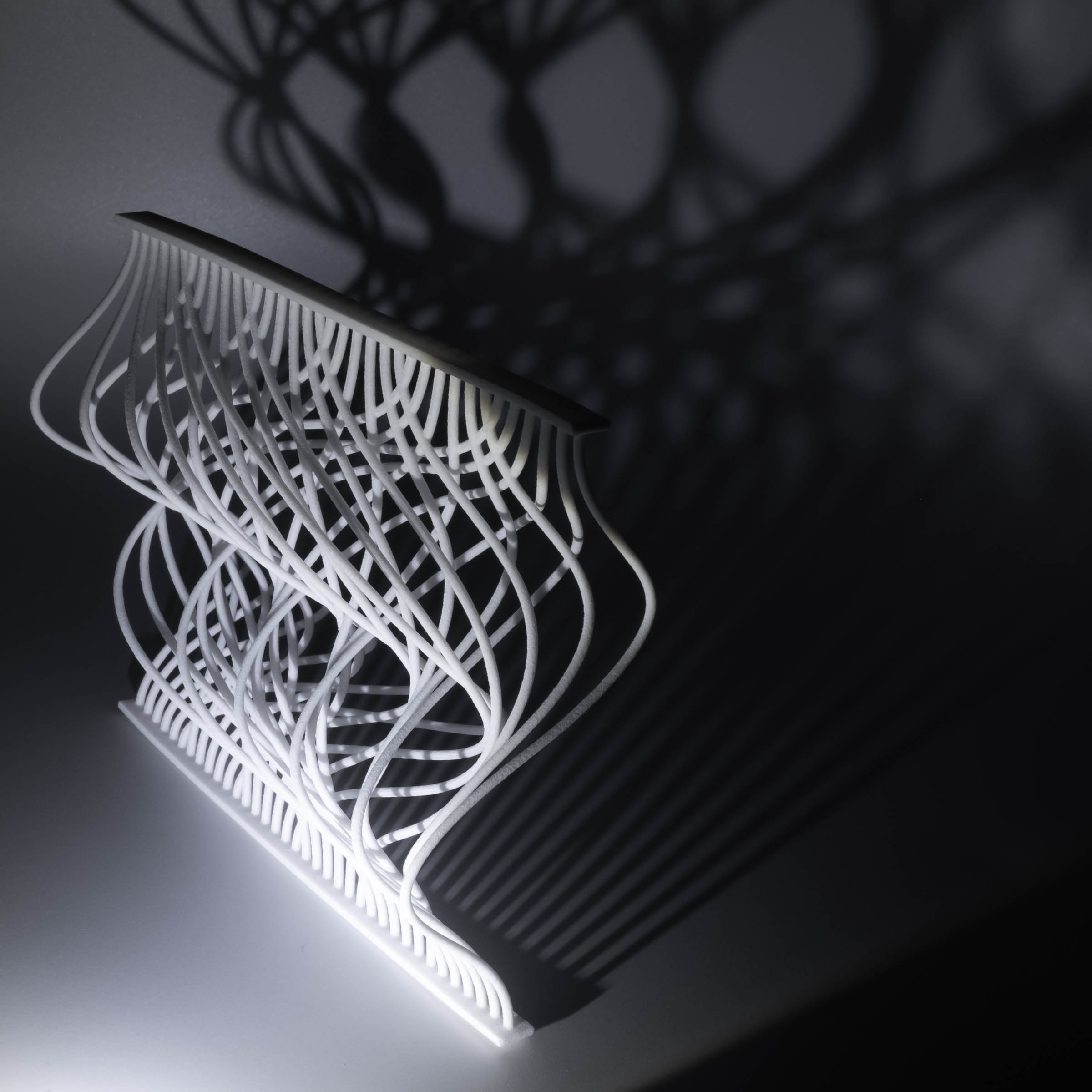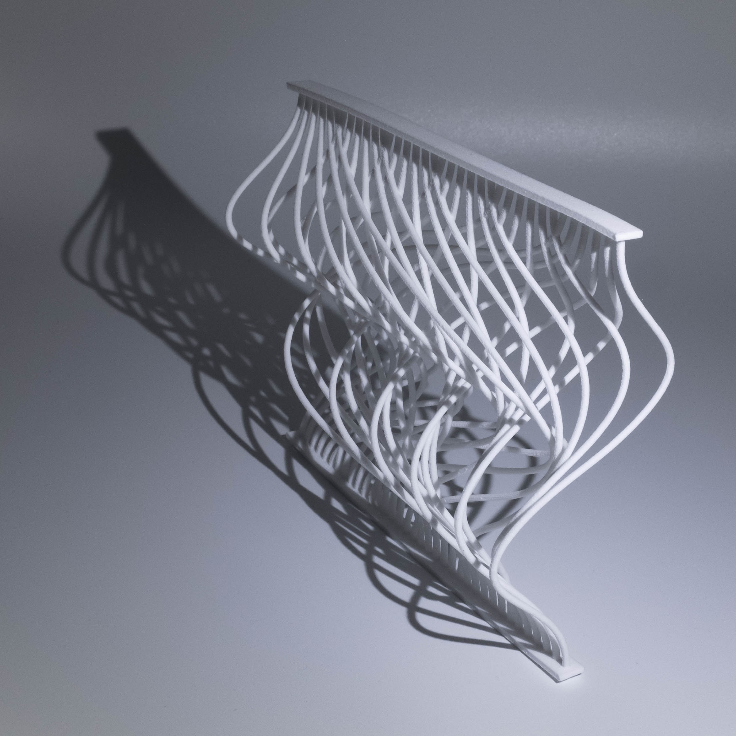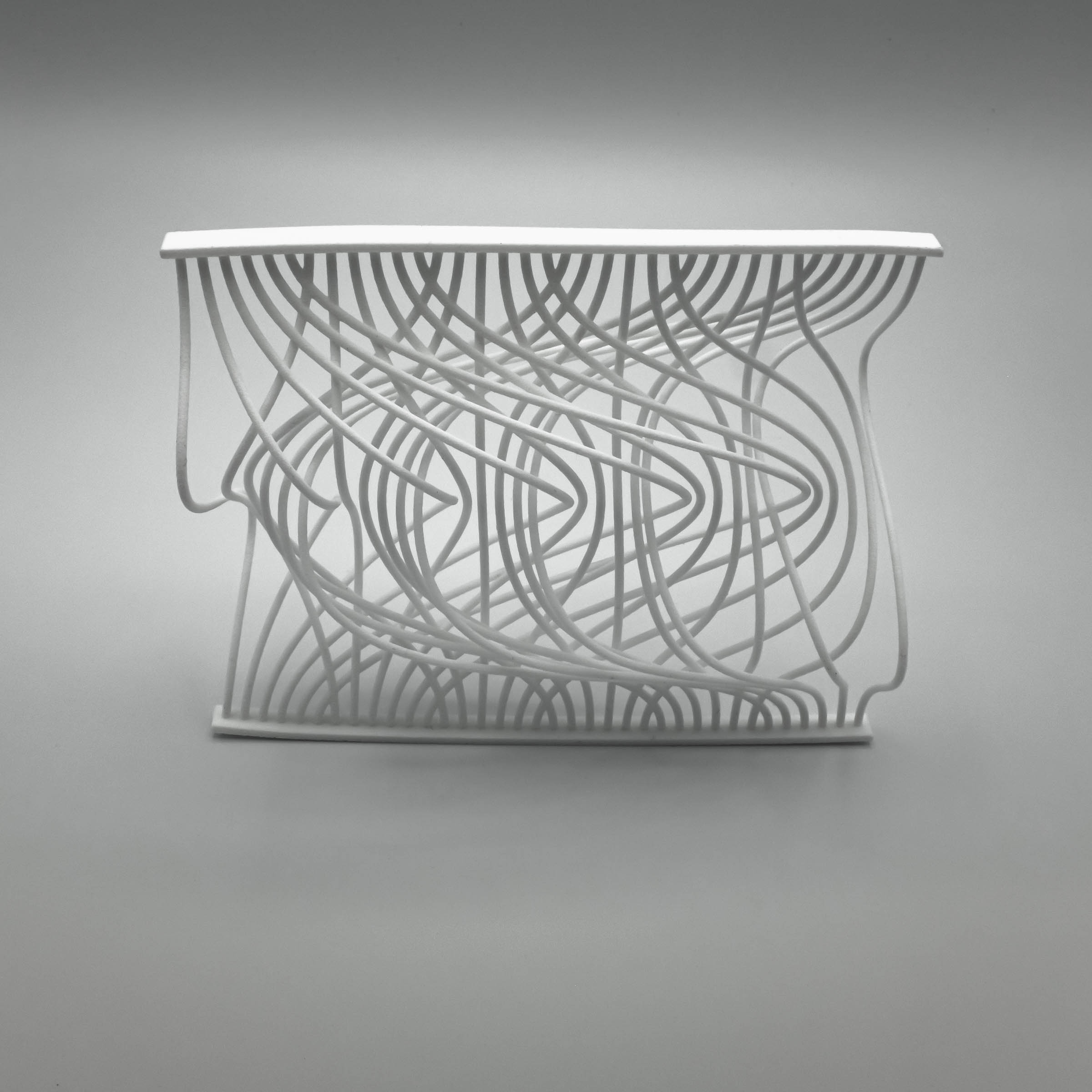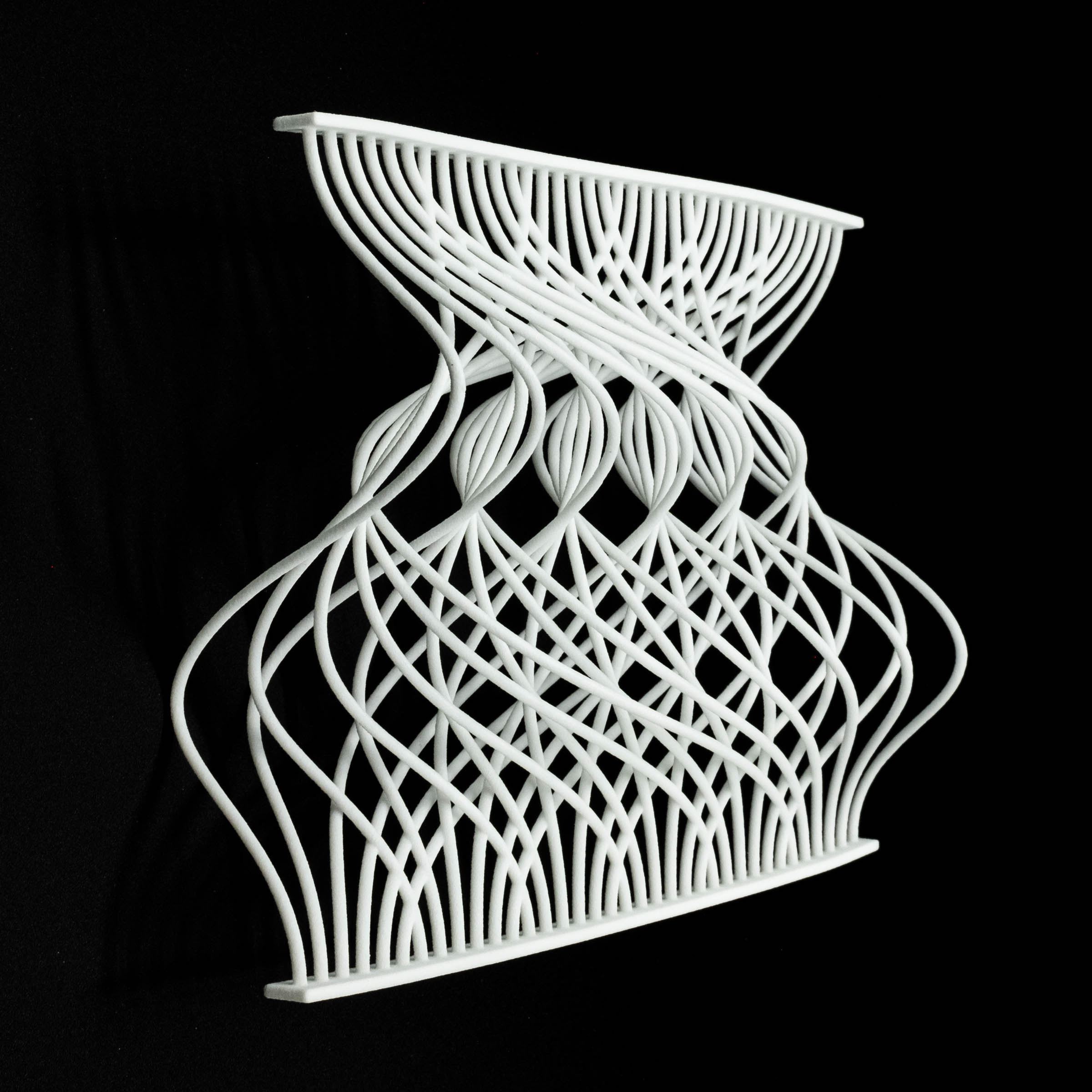 I have previously worked on visualizations of card shuffling and permutations, and I wanted to extend this to 3D. This is one attempt to do so. This 3D printed object illustrates two perfect out-shuffles with thirty-six cards and six piles. Each curve, from top to bottom, represents a single card, and after two perfect out-shuffles, the cards are restored to the original order. This was made with Processing and Rhino, and then produced by Shapeways.
