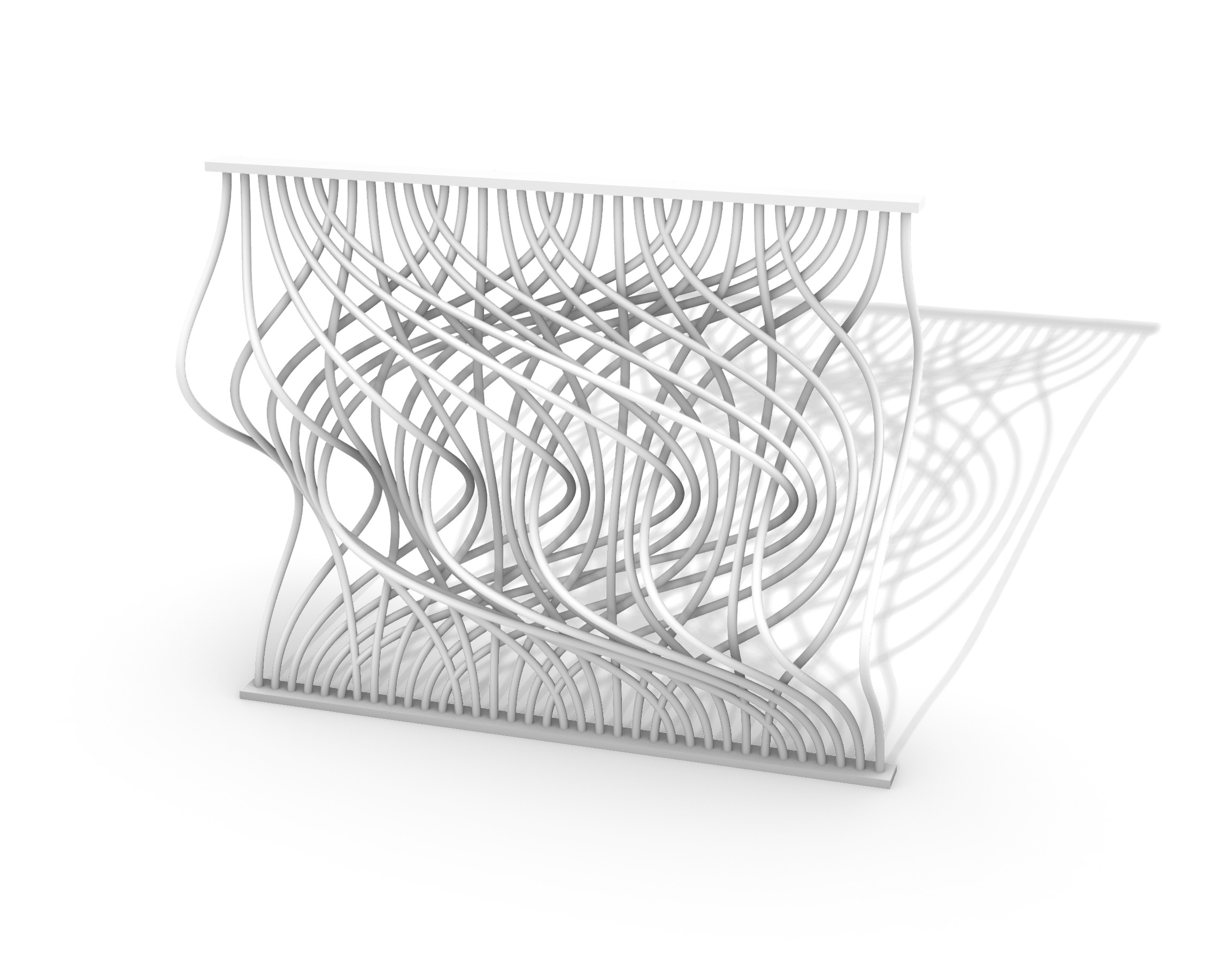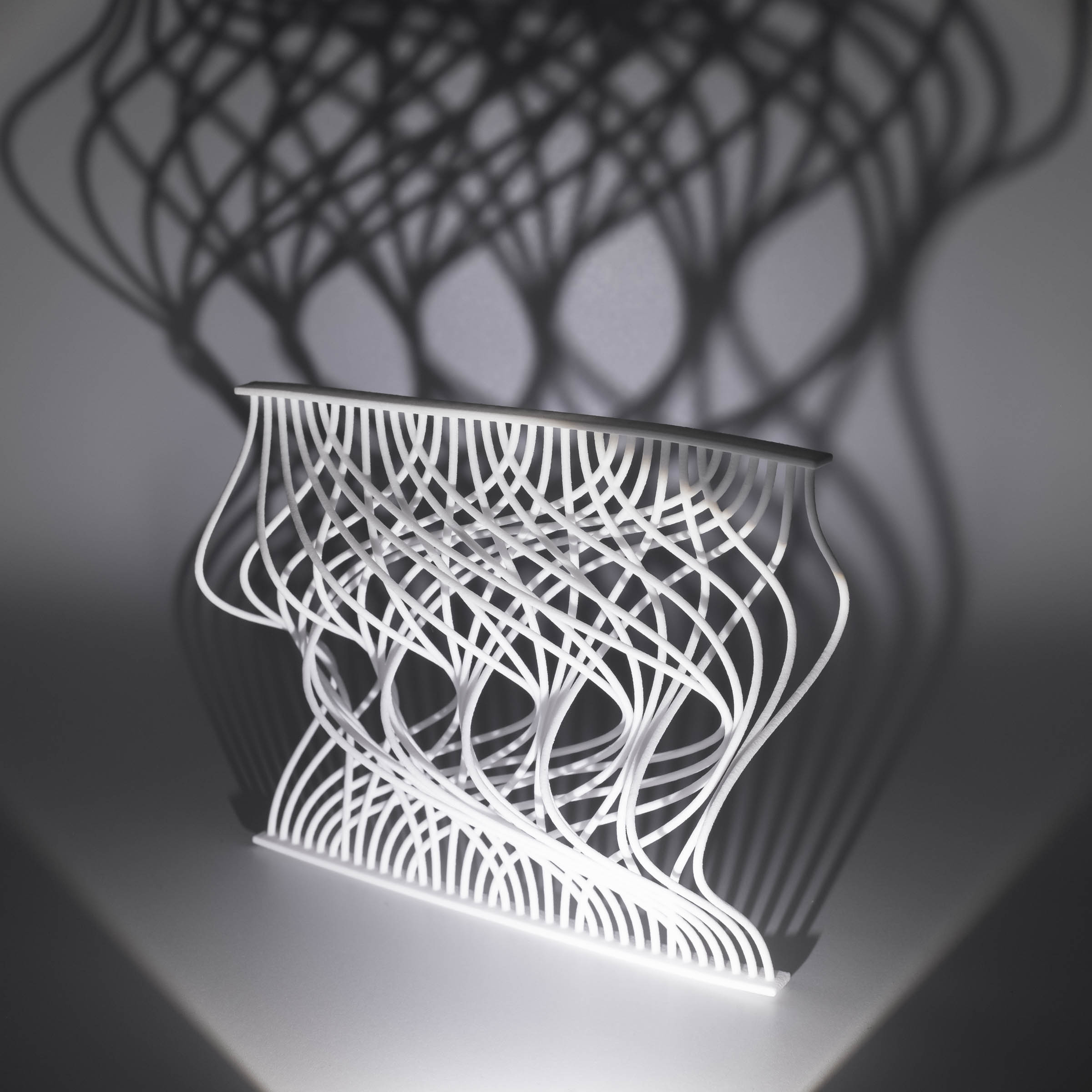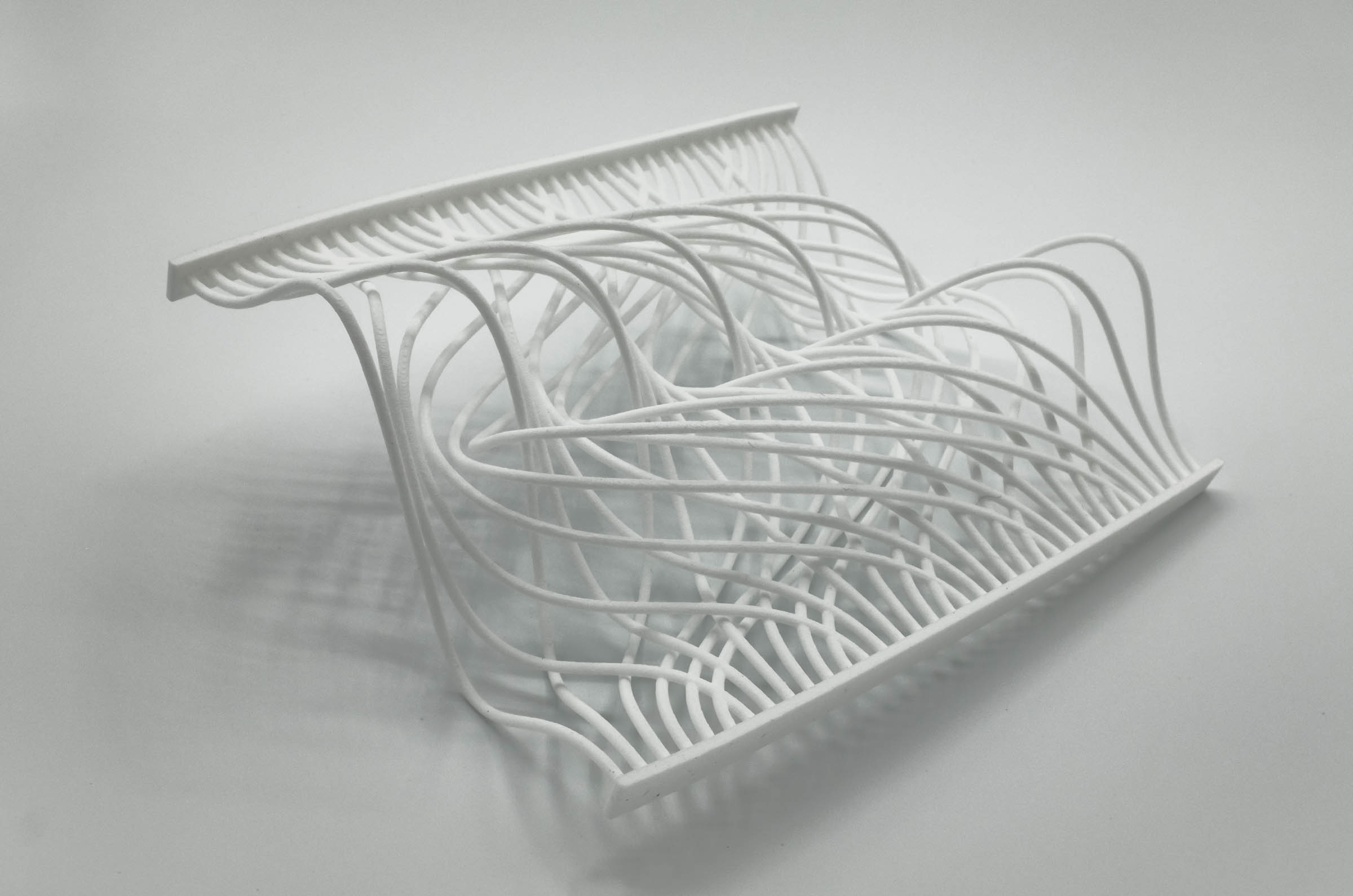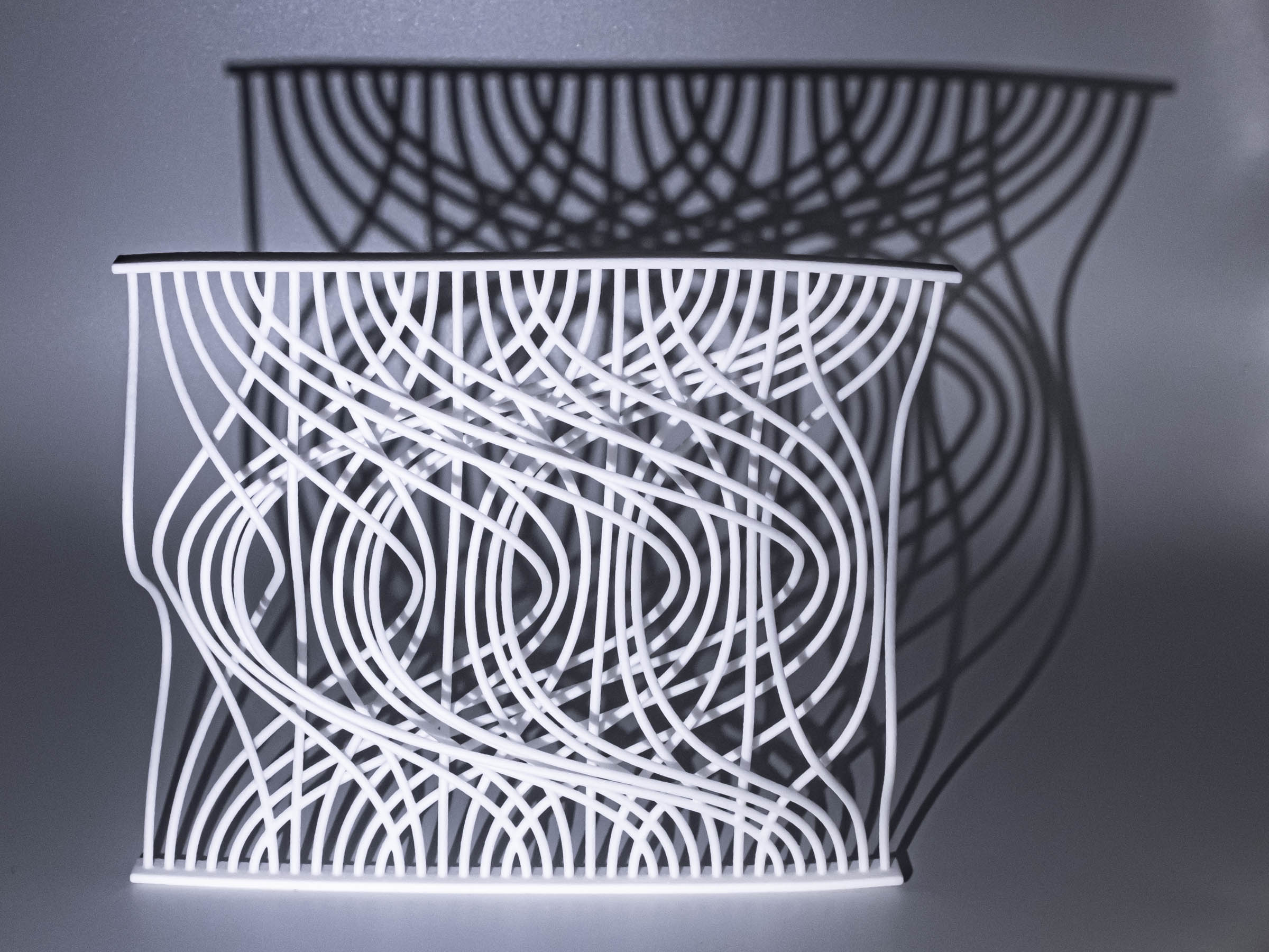 I have previously worked on visualizations of card shuffling and permutations, and I wanted to extend this to 3D. This is one attempt to do so. This 3D printed object illustrates two perfect out-shuffles with thirty-six cards and six piles. Each curve, from top to bottom, represents a single card, and after two perfect out-shuffles, the cards are restored to the original order. This was made with Processing and Rhino, and then produced by Shapeways.