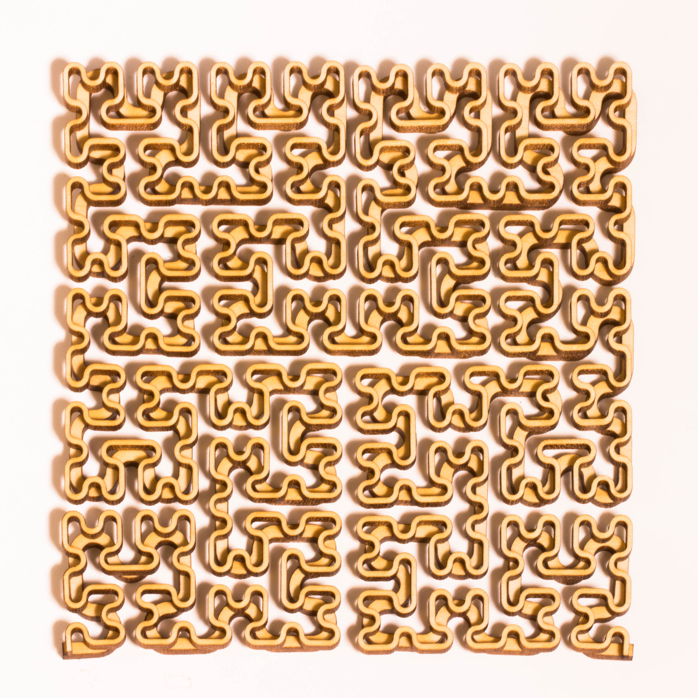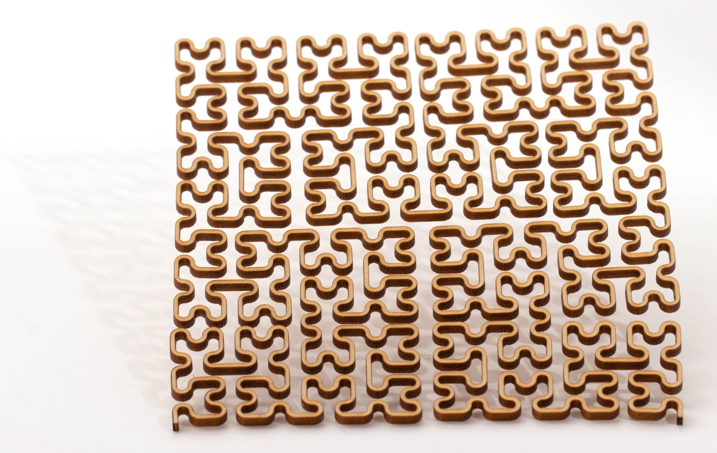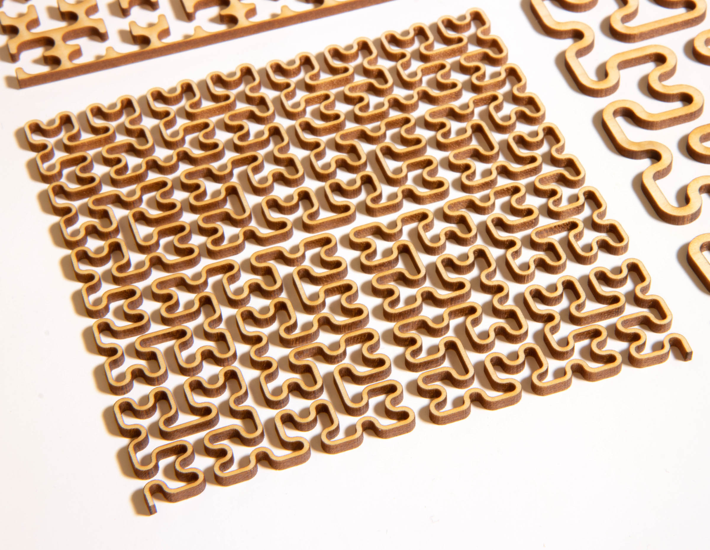 These are versions of the Hilbert curve made with a laser cutter in wood. Laser cutting opens up an enormous space of possibilities by its extreme precision. After a couple of minutes of laser cutting, you have created a piece of wood that it would take months or years to create by hand, if even possible.