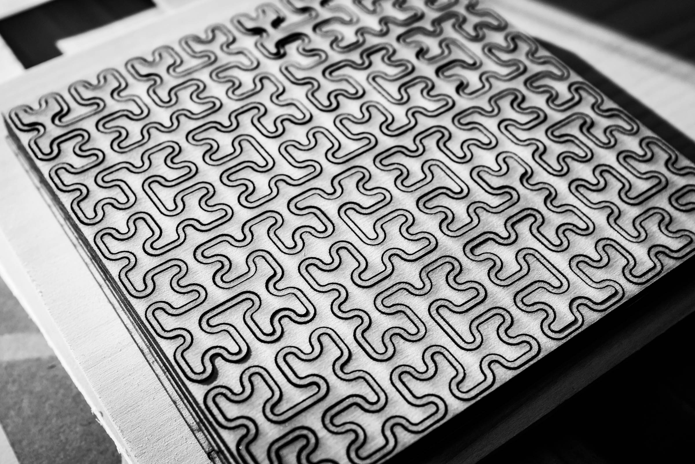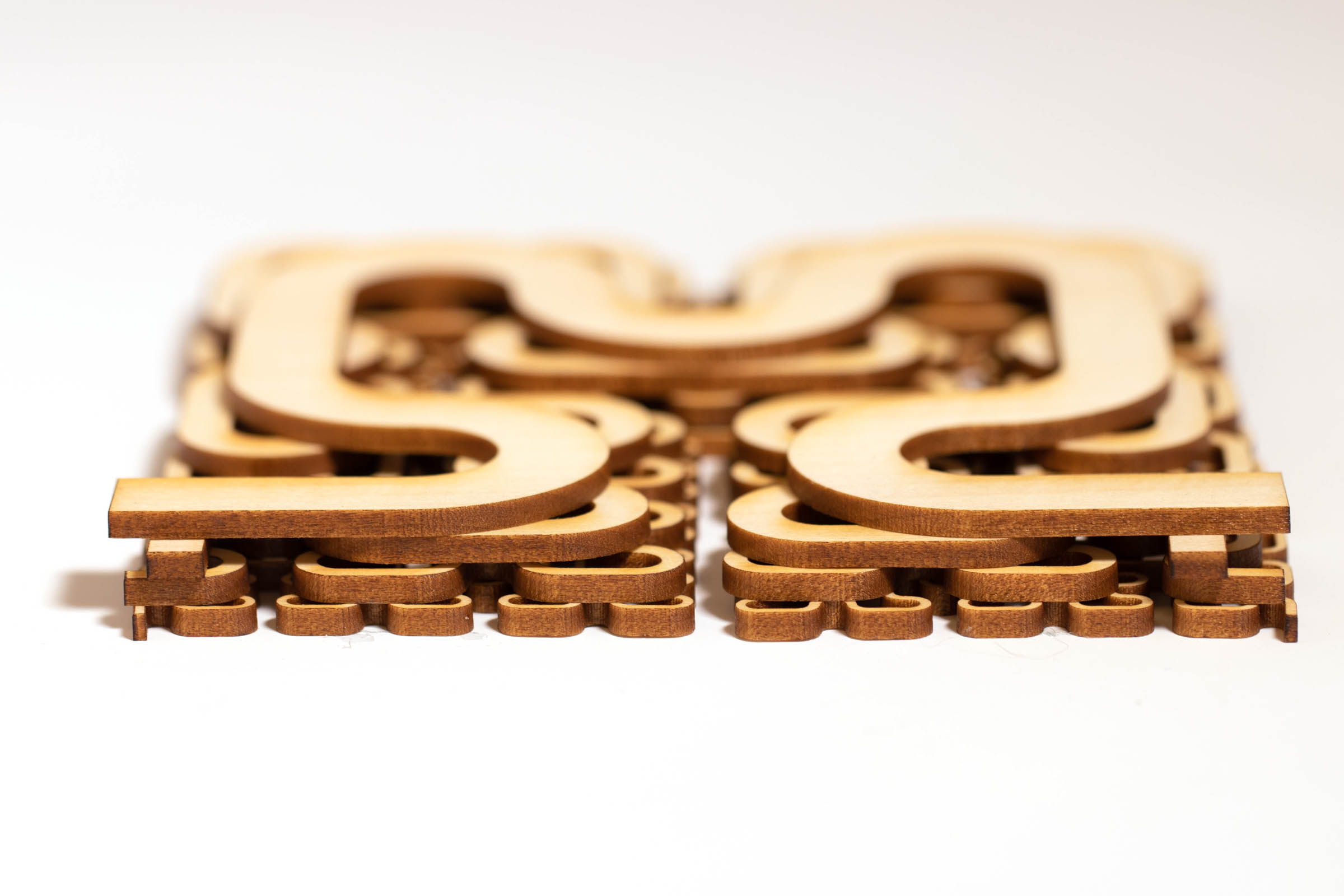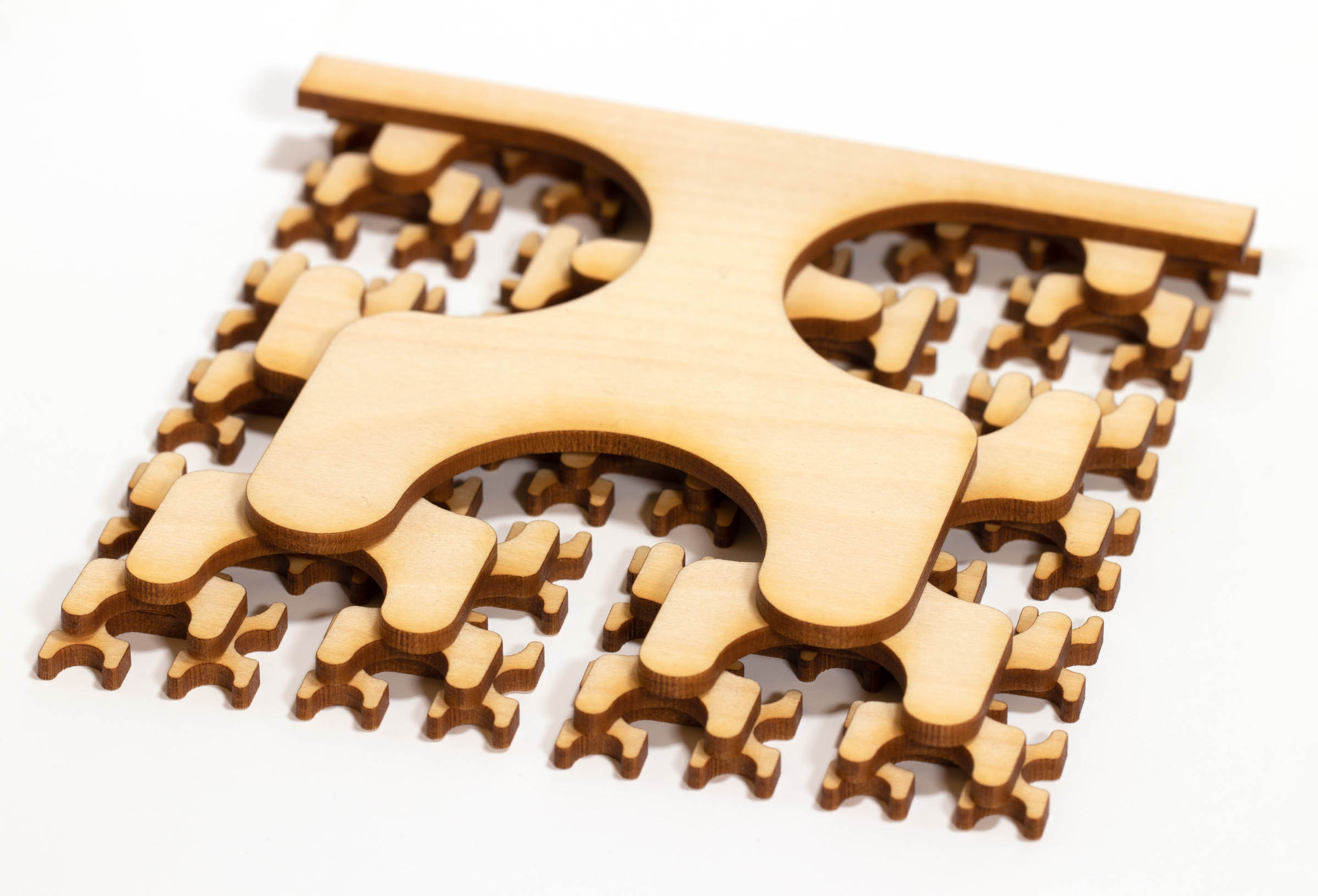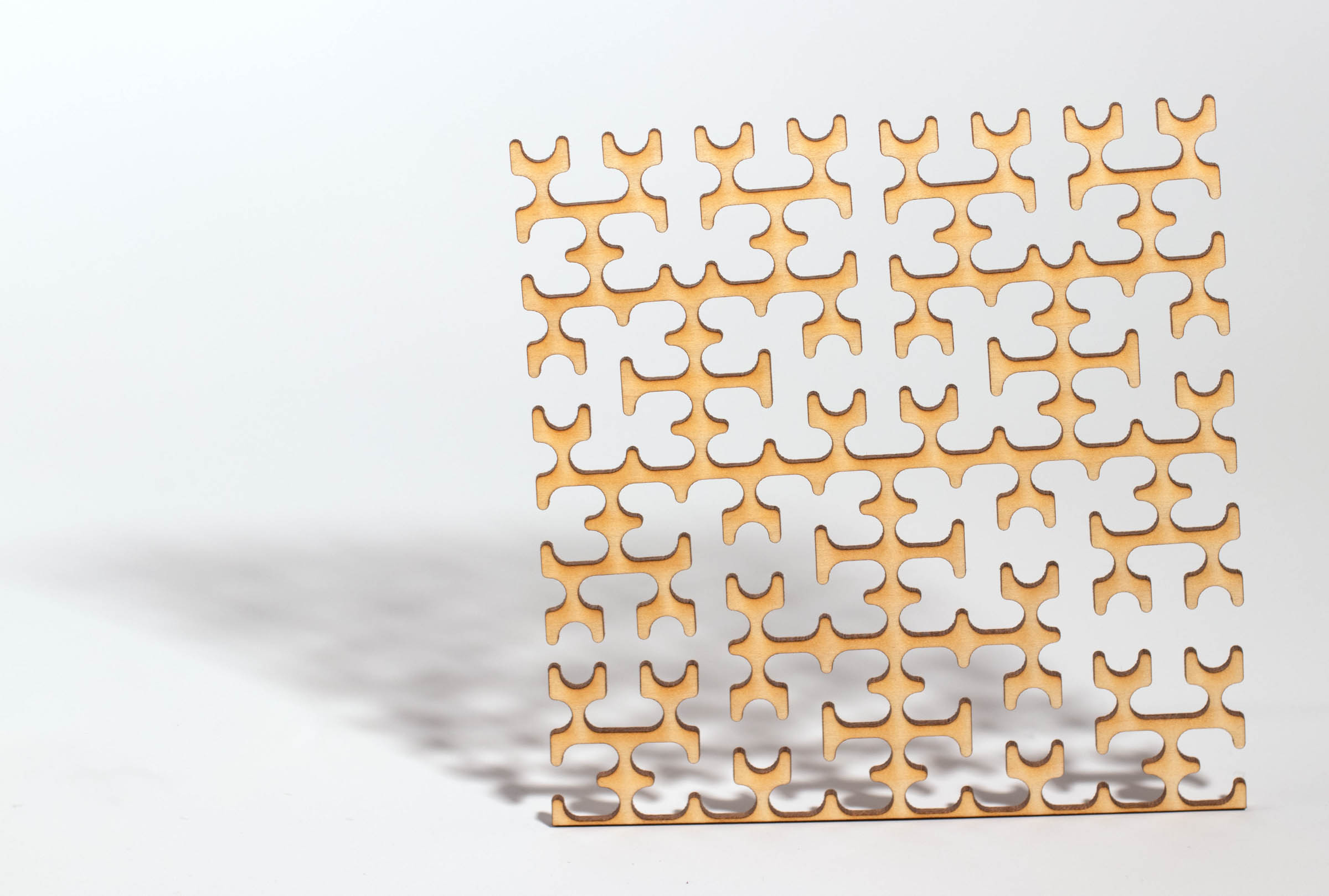 These are versions of the Hilbert curve made with a laser cutter in wood. Laser cutting opens up an enormous space of possibilities by its extreme precision. After a couple of minutes of laser cutting, you have created a piece of wood that it would take months or years to create by hand, if even possible.