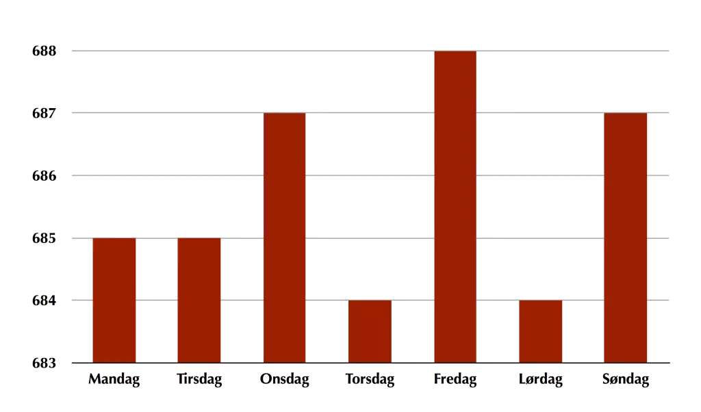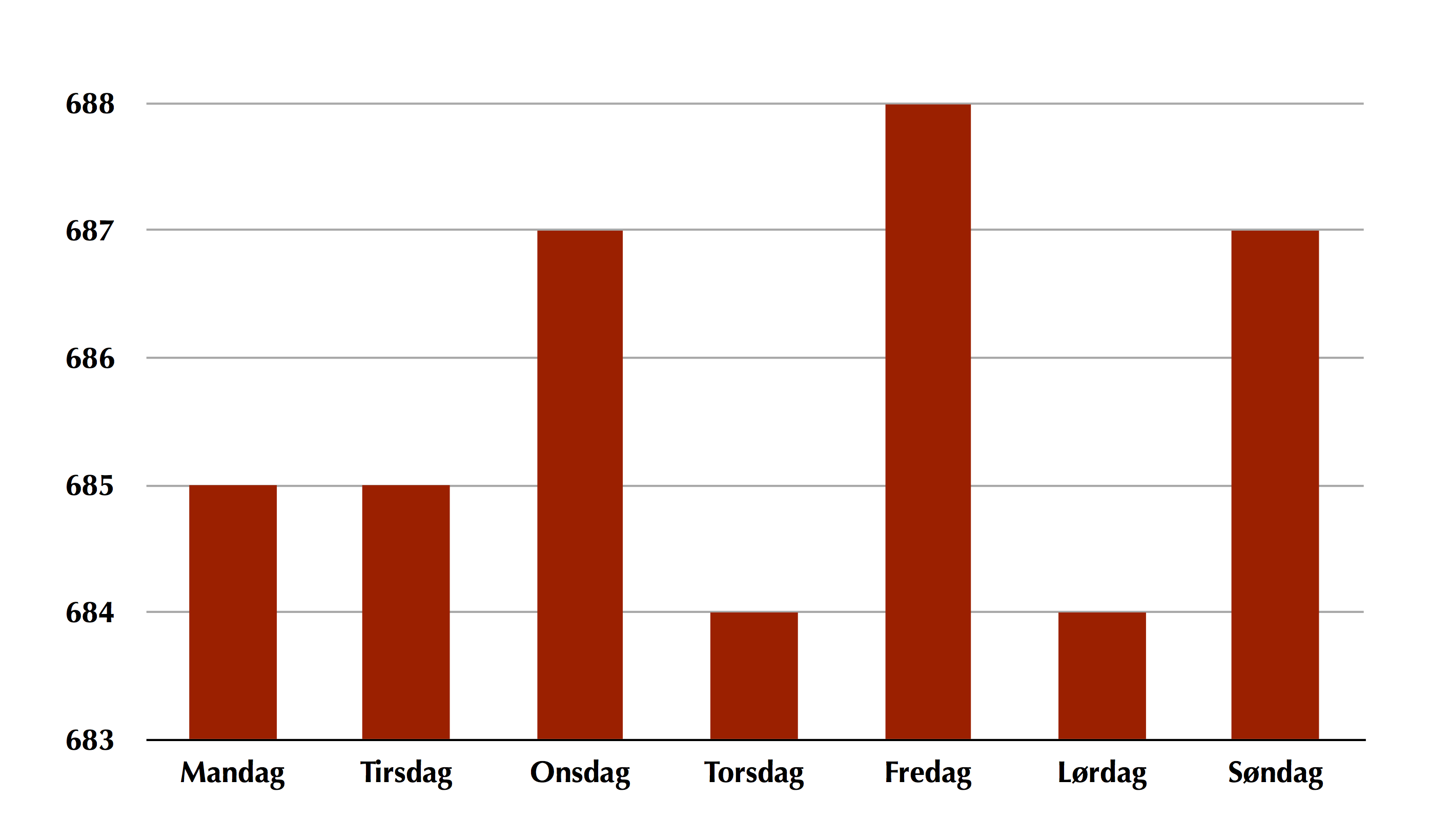 Spørsmålet er altså: Hvis vi ser på alle prikkene som markerer den trettende, hva er fordelingen mellom de ulike ukedagene?