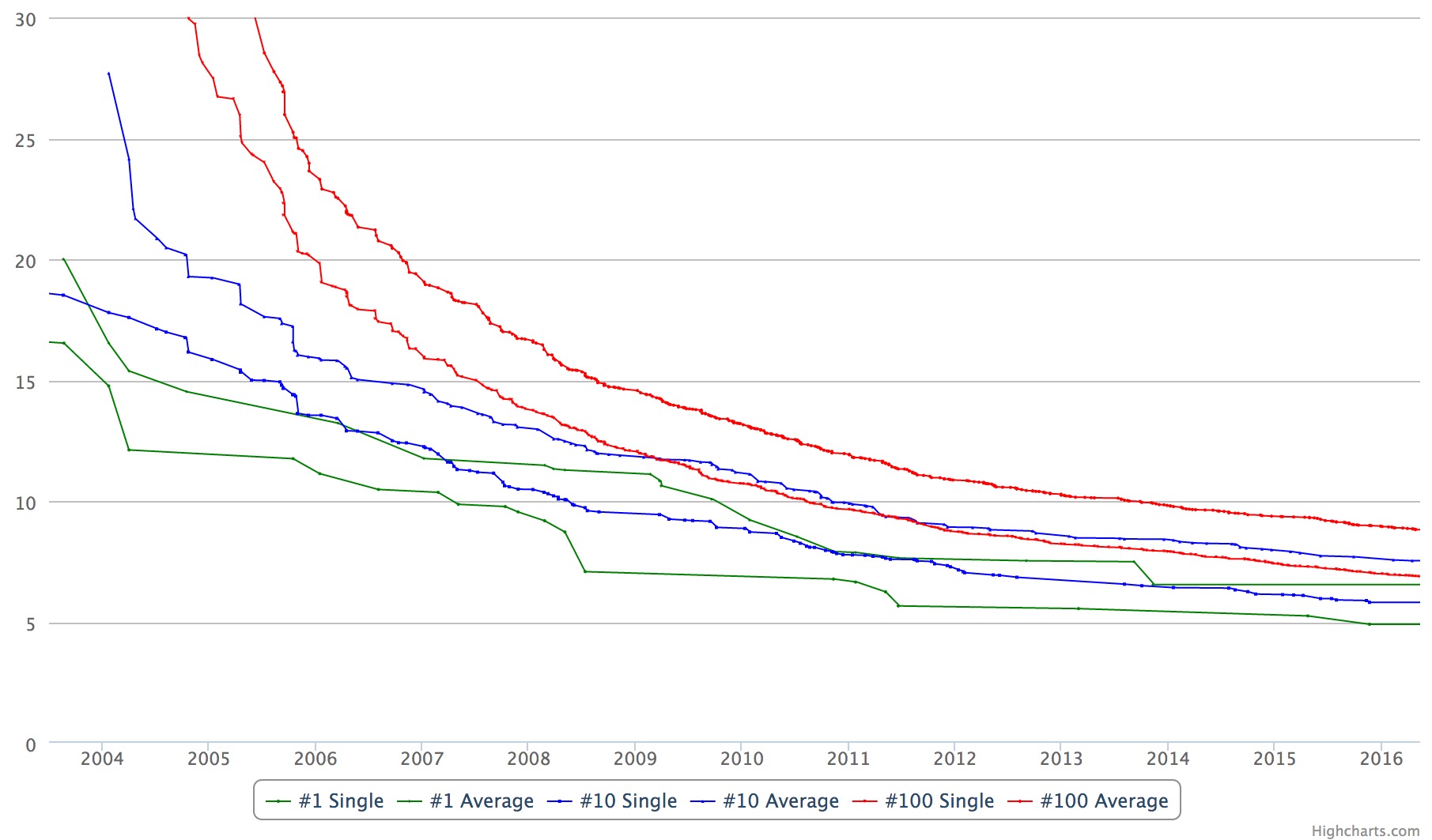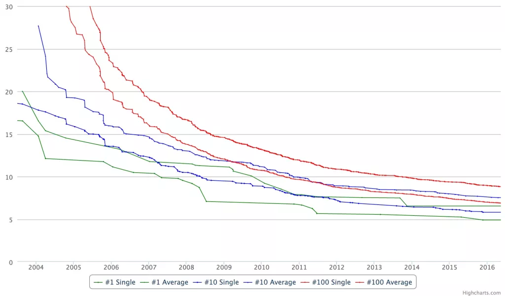 Det blir stadig satt nye rekorder i å løse kuben raskest mulig. Hvis vi ser på nettsidene til World Cube Association, en flott ressurs for konkurranser og registrerte kuberekorder, ser vi hvordan rekordene for den vanlige 3x3x3-kuben har utviklet seg fra 2004 til 2016:
