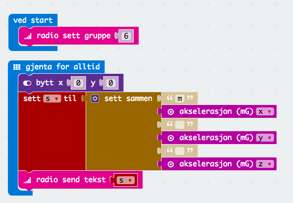 BBC micro:bit gjør det forbausende enkelt å programmere en sensor som sender data over radio til en laptop. Her er hva jeg gjorde. Først programmerte jeg en micro:bit til å sende data fra akselerometeret på følgende måte: