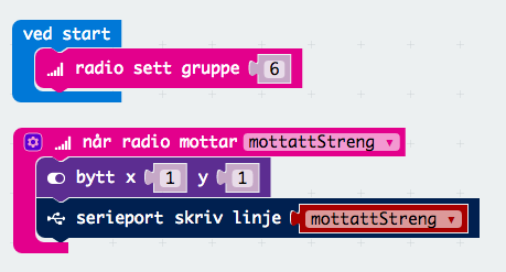 Deretter programmerte jeg en annen micro:bit til å lytte til sin radio og sende videre alt den mottar til en seriellport på følgende måte.