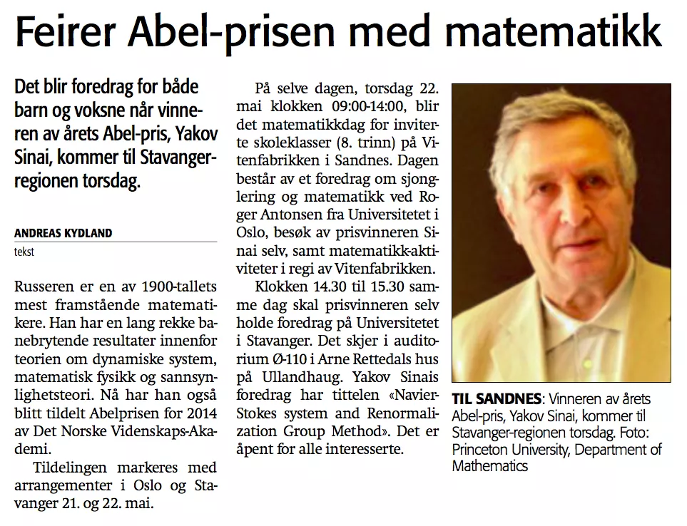 Dagen består av et foredrag om sjonglering og matematikk ved Roger Antonsen fra Universitetet i Oslo, besøk av prisvinneren Sinai selv, samt matematikk-aktiviteter i regi av Vitenfabrikken.