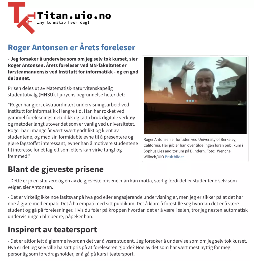 Roger har gjort ekstraordinært undervisningsarbeid ved Institutt for informatikk i lengre tid. Han har rokket ved gammel forelesningsmetodikk og tatt i bruk digitale verktøy og metoder langt utover det som er vanlig ved universitetet. Roger har i mange år vært svært godt likt og kjent av studentene, og med sin formidable evne til å presentere og gjøre fagstoffet interessant, evner han å motivere studentene til interesse for et fagfelt som ellers kan virke tungt og fremmed.