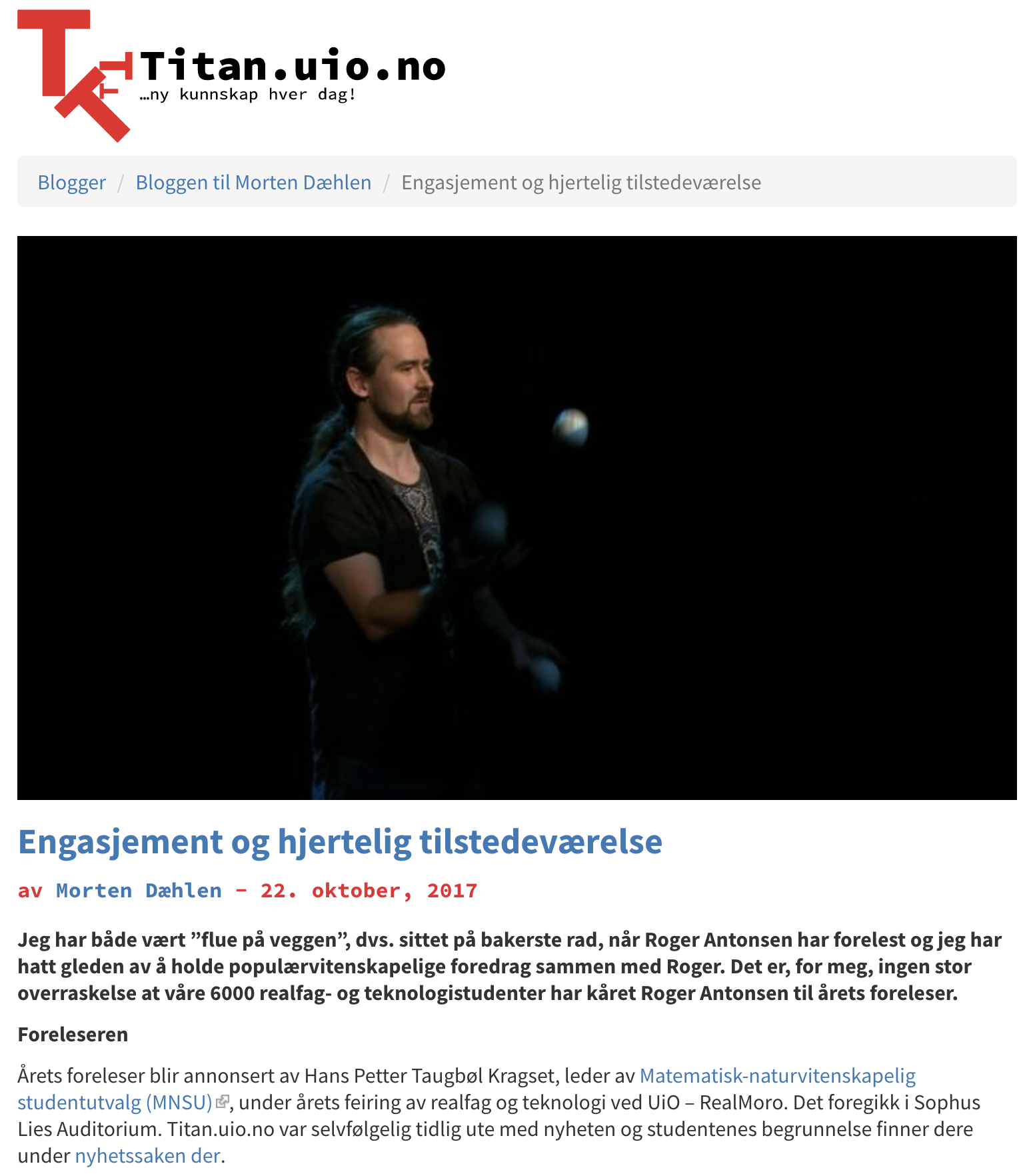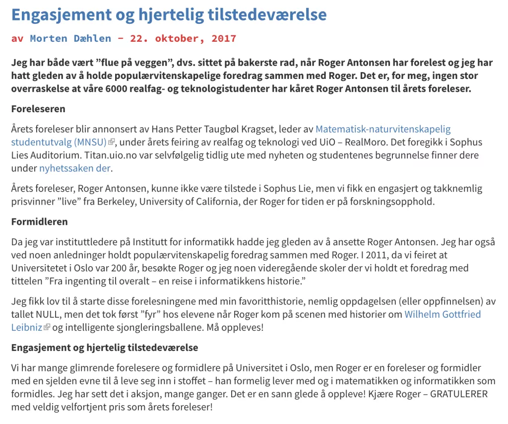 Jeg har både vært "flue på veggen", dvs. sittet på bakerste rad, når Roger Antonsen har forelest og jeg har hatt gleden av å holde populærvitenskapelige foredrag sammen med Roger. Det er, for meg, ingen stor overraskelse at våre 6000 realfag- og teknologistudenter har kåret Roger Antonsen til årets foreleser.