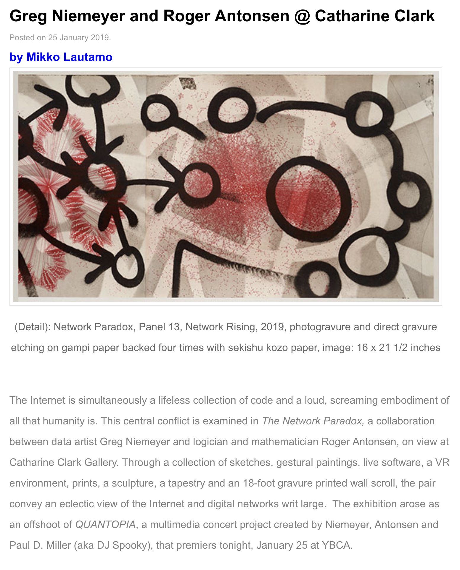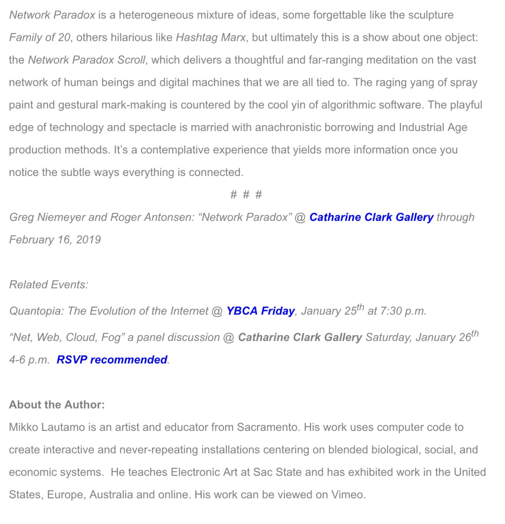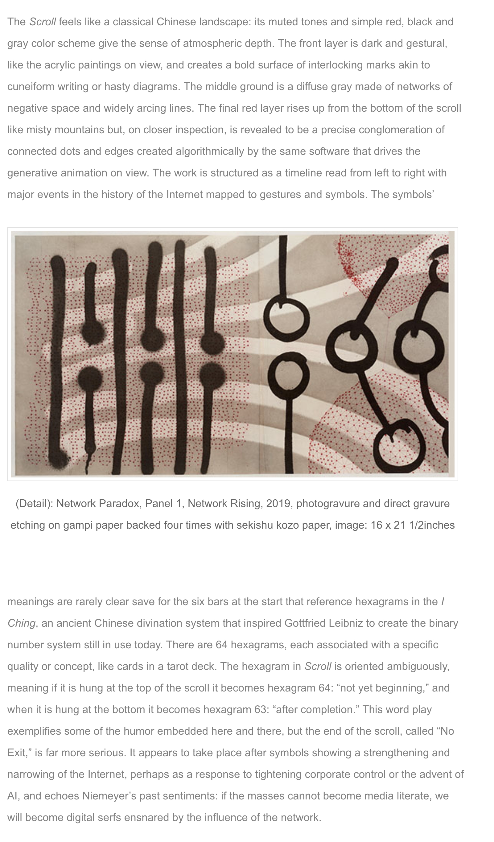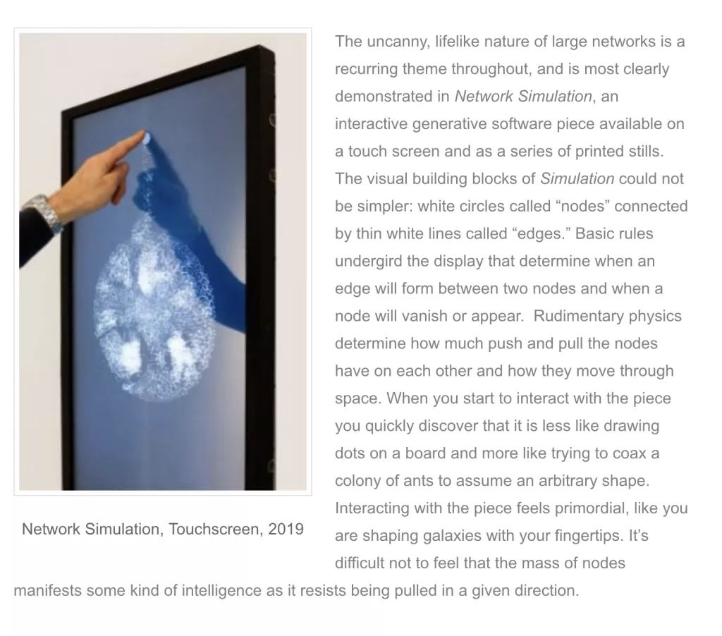 Den nifse, livaktige naturen til store nettverk er et gjentakende tema gjennom det hele, og er tydeligst demonstrert i Network Simulation, et interaktivt generativt program som er tilgjengelig på en berøringsskjerm og som en serie trykte stillbilder. De visuelle byggeblokkene til simuleringen kunne ikke ha vært enklere: Hvite sirkler kalt "noder" forbundet med tynne hvite linjer kalt "kanter". Grunnleggende regler ligger under og bestemmer når en kant skal dannes mellom to noder og når en kant vil forsvinne eller vises. Rudimentær fysikk bestemmer hvor mye trykk og trekk noder har på hverandre og hvordan de beveger seg gjennom rommet. Når du begynner å samhandle med verket, oppdager du raskt at det er mindre som å tegne prikker på et skjerm og mer som å prøve å samle en koloni av maur for å anta en vilkårlig form. Interagere med stykket føles primordialt, som om du former galakser med fingertuppene. Det er vanskelig å ikke føle at massen av noder manifesterer en slags intelligens som motstår å bli trukket i en bestemt retning. [Fritt oversatt.]