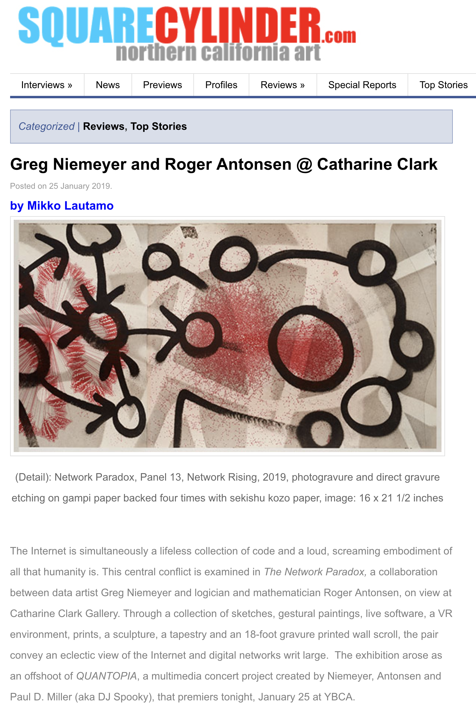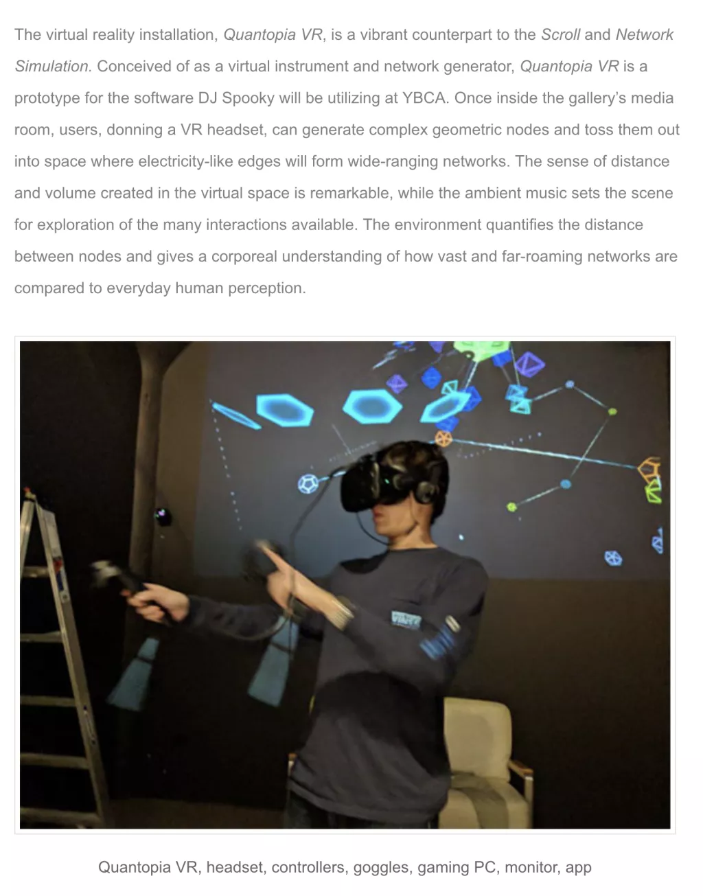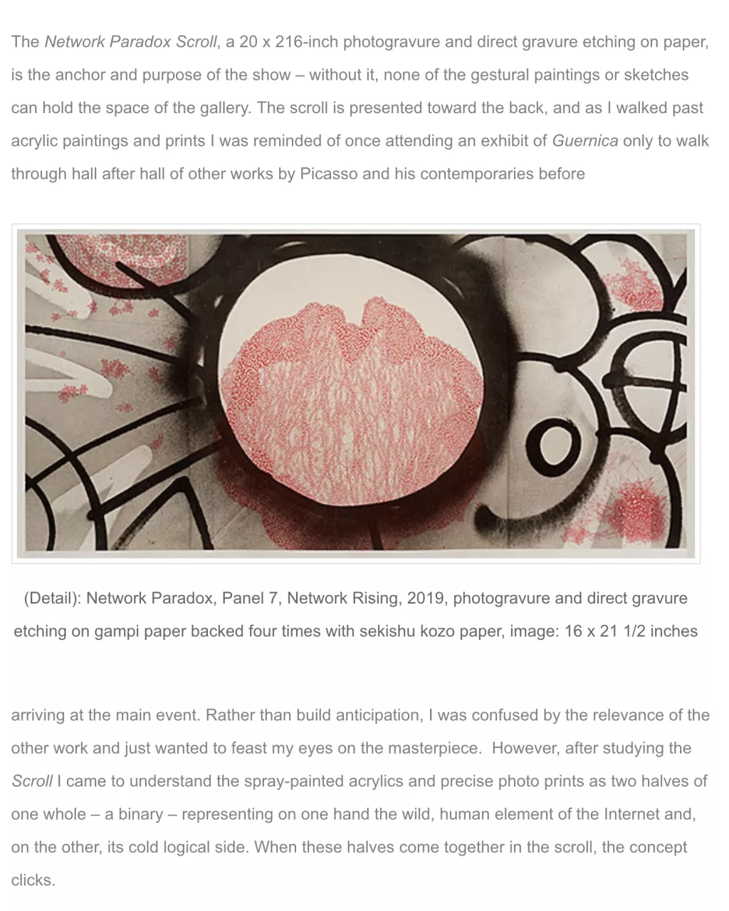 Den nifse, livaktige naturen til store nettverk er et gjentakende tema gjennom det hele, og er tydeligst demonstrert i Network Simulation, et interaktivt generativt program som er tilgjengelig på en berøringsskjerm og som en serie trykte stillbilder. De visuelle byggeblokkene til simuleringen kunne ikke ha vært enklere: Hvite sirkler kalt "noder" forbundet med tynne hvite linjer kalt "kanter". Grunnleggende regler ligger under og bestemmer når en kant skal dannes mellom to noder og når en kant vil forsvinne eller vises. Rudimentær fysikk bestemmer hvor mye trykk og trekk noder har på hverandre og hvordan de beveger seg gjennom rommet. Når du begynner å samhandle med verket, oppdager du raskt at det er mindre som å tegne prikker på et skjerm og mer som å prøve å samle en koloni av maur for å anta en vilkårlig form. Interagere med stykket føles primordialt, som om du former galakser med fingertuppene. Det er vanskelig å ikke føle at massen av noder manifesterer en slags intelligens som motstår å bli trukket i en bestemt retning. [Fritt oversatt.]