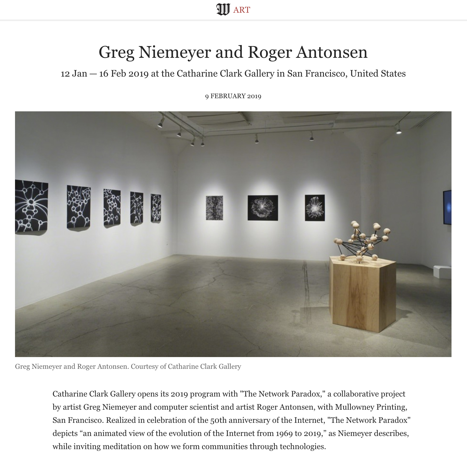 Catharine Clark Gallery åpner sitt 2019-program med «The Network Paradox», et samarbeidsprosjekt av kunstneren Greg Niemeyer og datavitenskapsmann og kunstner Roger Antonsen, med Mullowney Printing, San Francisco. Realisert for å feire-50 års jubiléet av Internett, viser «Nettverksparadokset» en «animert fremstilling av utviklingen av Internett fra 1969 til 2019», som Niemeyer beskriver, mens han inviterer til en meditasjon om hvordan vi danner samfunn gjennom teknologier. [Fritt oversatt]