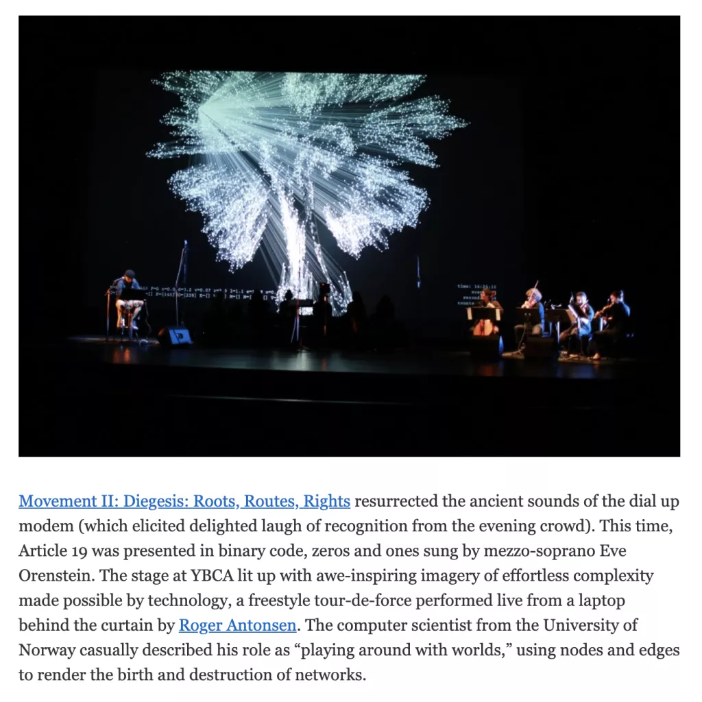 The stage at YBCA lit up with awe-inspiring imagery of effortless complexity made possible by technology, a freestyle tour-de-force performed live from a laptop behind the curtain by Roger Antonsen. The computer scientist from the University of Norway casually described his role as “playing around with worlds,” using nodes and edges to render the birth and destruction of networks.