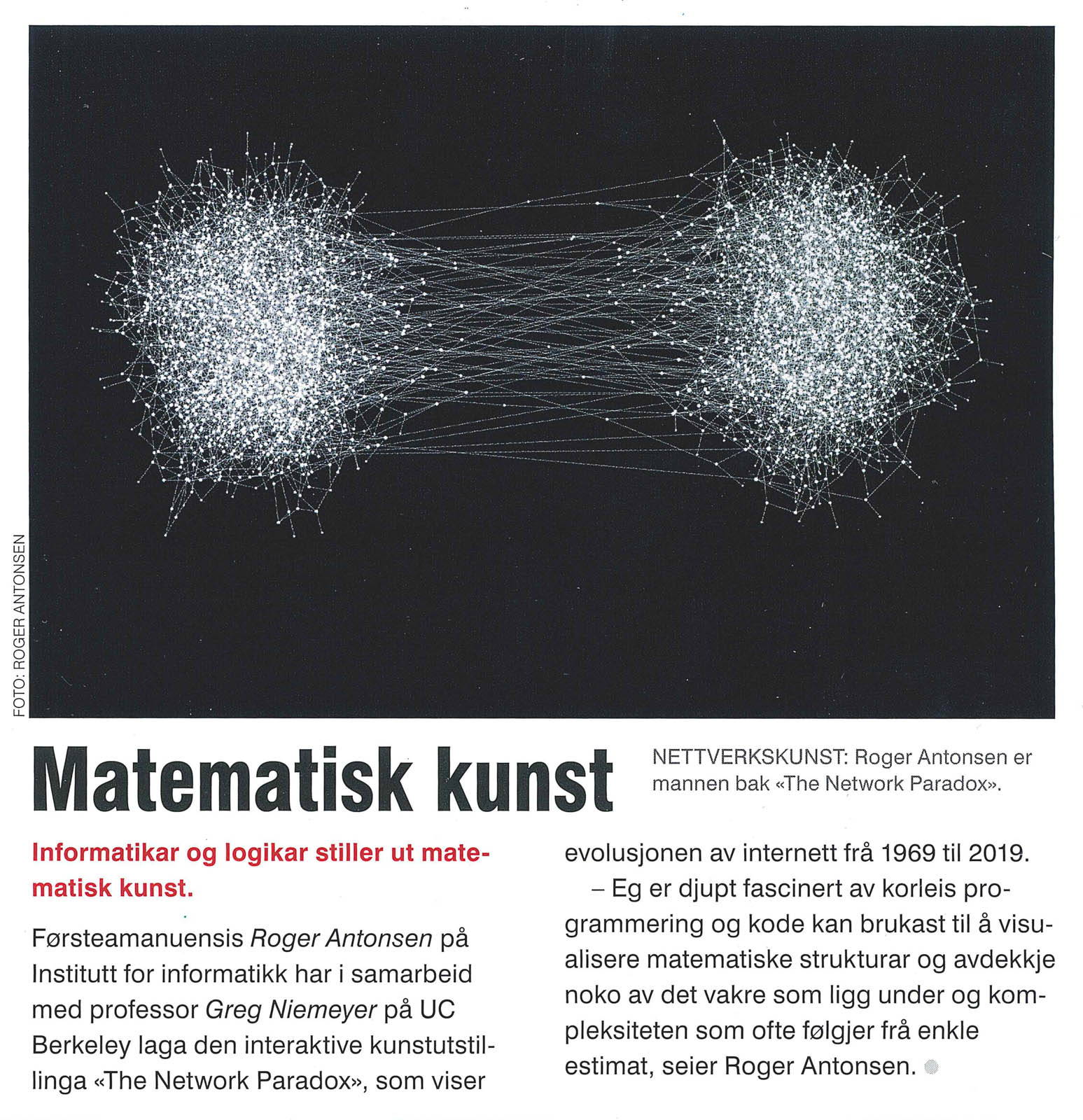 Informatikar og logikar stiller ut matematisk kunst. Førsteamanuensis Roger Antonsen på Institutt for informatikk har i samarbeid med professor Greg Niemeyer på UC Berkeley laga den interaktive kunstutstillinga «The Network Paradox», som viser evolusjonen av internett frå 1969 til 2019. – Eg er djupt fascinert av korleis programmering og kode kan brukast til å visualisere matematiske strukturar og avdekkje noko av det vakre som ligg under og kompleksiteten som ofte følgjer frå enkle estimat [korrekt: antakelser], seier Roger Antonsen.