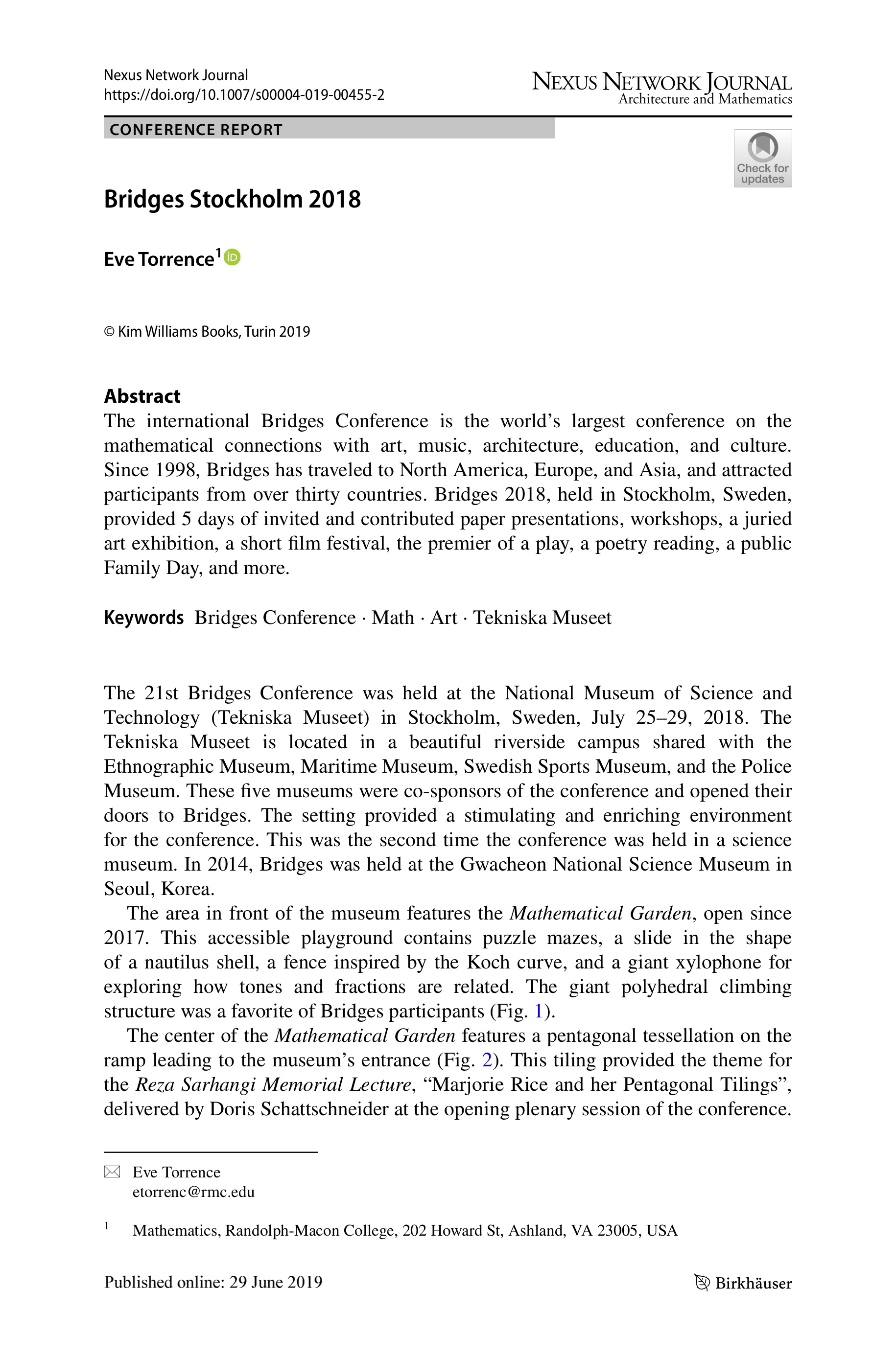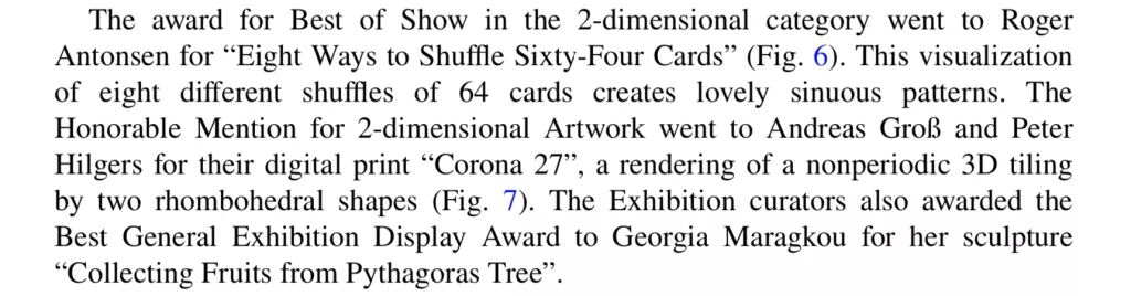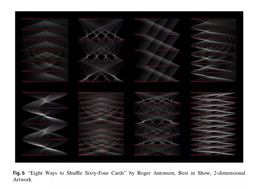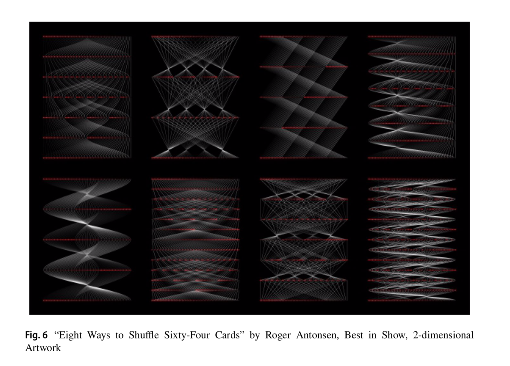 The award for Best of Show in the 2-dimensional category went to Roger Antonsen for “Eight Ways to Shuffle Sixty-Four Cards”. This visualization of eight different shuffles of 64 cards creates lovely sinuous patterns.