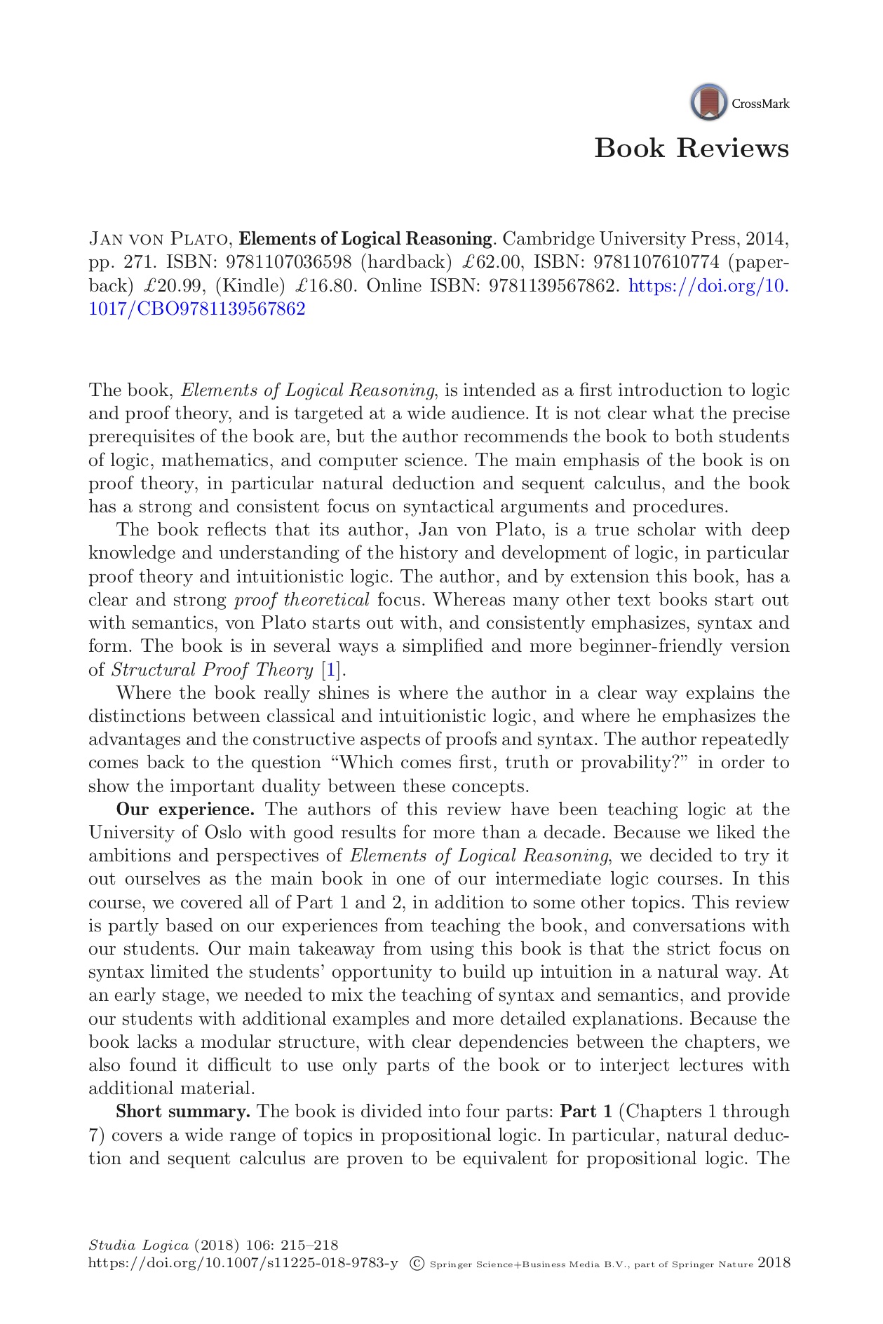 title = {Book Review: Jan von Plato, Elements of Logical Reasoning},