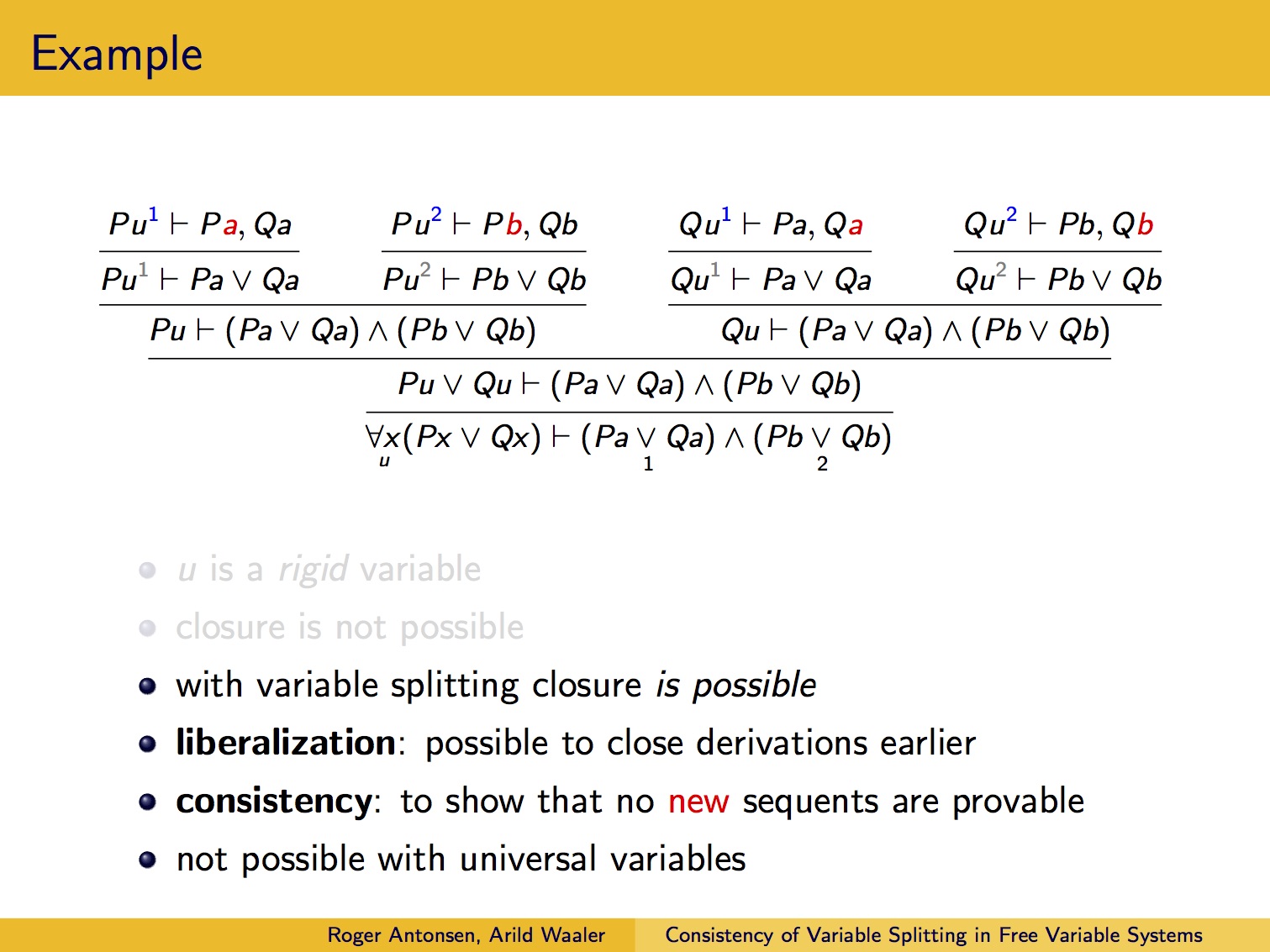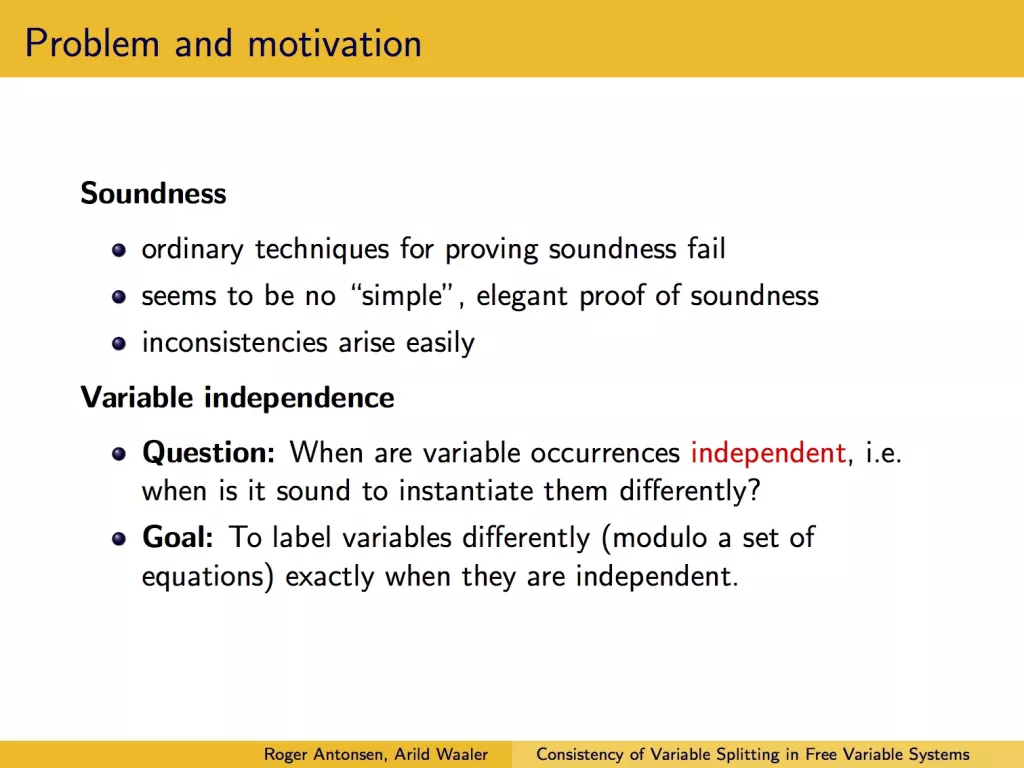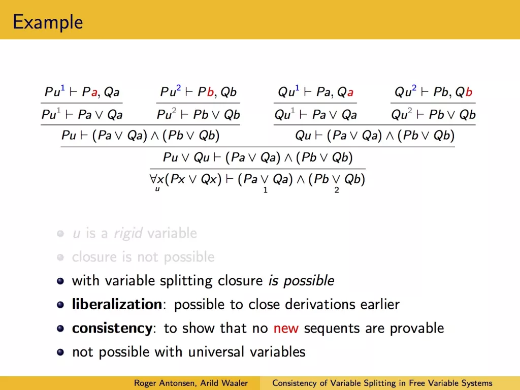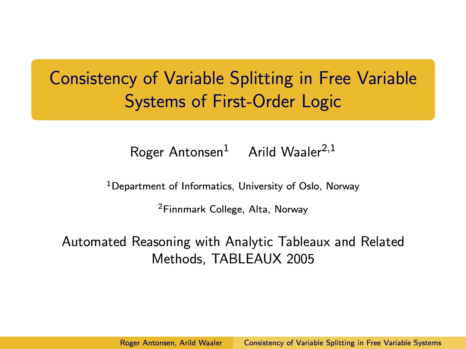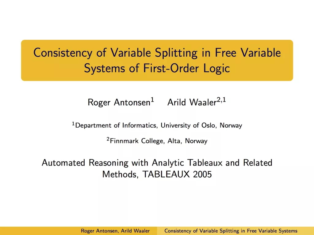 Presentasjon av artikkelen Consistency of Variable Splitting in Free Variable Systems of First-Order Logic under Automated Reasoning with Analytic Tableaux and Related Methods 2005.