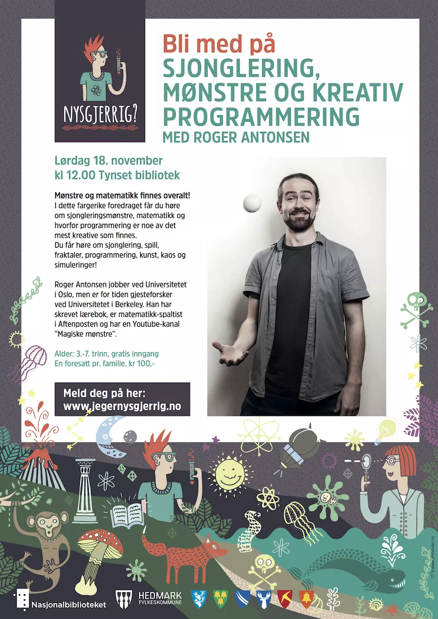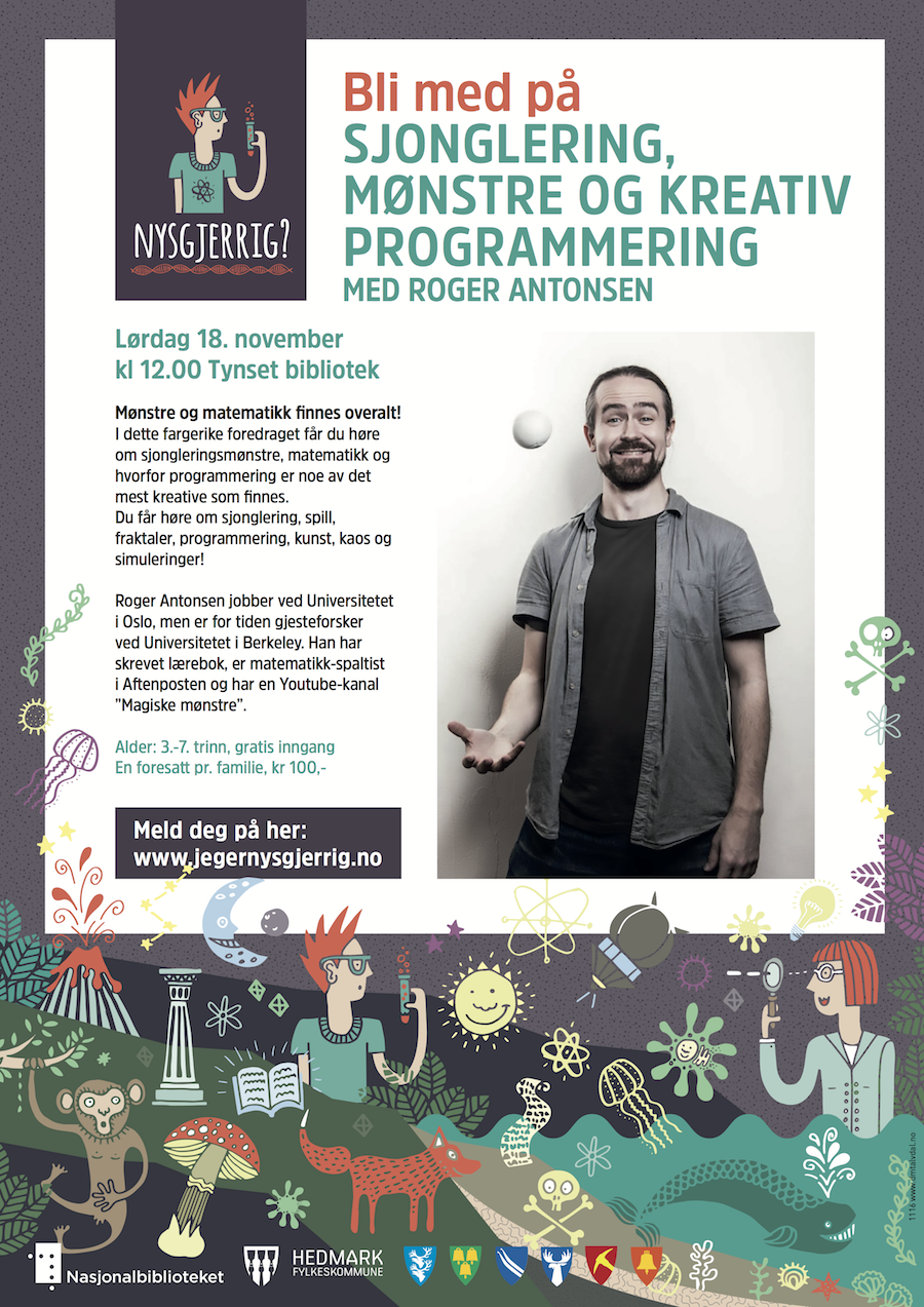 Mønstre og matematikk finnes overalt! I dette fargerike og underholdende foredraget får du høre om sjongleringsmønstre, matematikk og hvorfor programmering er noe av det mest kreative som finnes. Du får høre om sjonglering, spill, fraktaler, programmering, kunst, kaos og simuleringer!