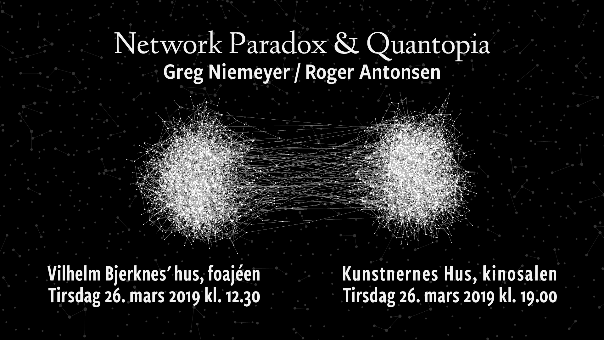 Greg Niemeyer og Roger Antonsen presenterer utdrag fra deres siste samarbeidsprosjekter, The Network Paradox, som nylig ble fremvist ved Catharine Clark Gallery i San Francisco, og Quantopia: The Evolution of the Internet, en multimedie-symfoni av Paul D. Miller aka DJ Spooky, som akkurat hadde verdenspremiere i San Francisco. Niemeyer og Antonsen diskuterer kunsten, konseptene, prosessene og visualiseringene knyttet til disse produksjonene. Greg Niemeyer (https://www.gregniemeyer.com/) er professor ved Berkeley Center for New Media ved UC Berkeley, California, og Roger Antonsen (/) er førsteamanuensis i informatikk ved Institutt for informatikk ved Universitetet i Oslo.
