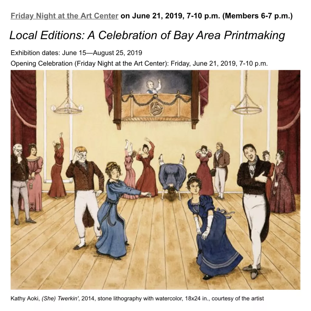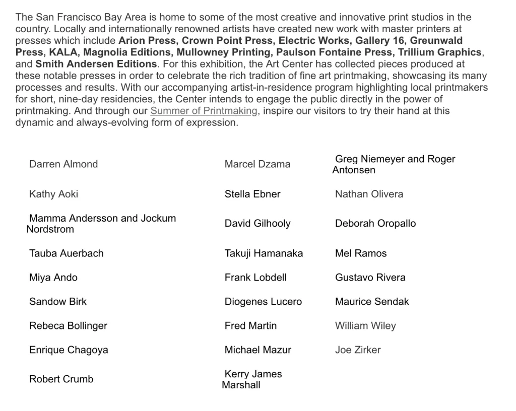 The San Francisco Bay Area is home to some of the most creative and innovative print studios in the country. Locally and internationally renowned artists have created new work with master printers at presses which include Arion Press, Crown Point Press, Electric Works, Gallery 16, Greunwald Press, KALA, Magnolia Editions, Mullowney Printing, Paulson Fontaine Press, Trillium Graphics, and Smith Andersen Editions. For this exhibition, the Art Center has collected pieces produced at these notable presses in order to celebrate the rich tradition of fine art printmaking, showcasing its many processes and results. With our accompanying artist-in-residence program highlighting local printmakers for short, nine-day residencies, the Center intends to engage the public directly in the power of printmaking. And through our Summer of Printmaking, inspire our visitors to try their hand at this dynamic and always-evolving form of expression.